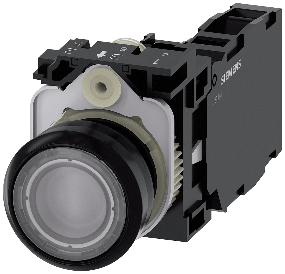 pulsante luminoso, 22 mm, rotondo, in plastica, trasparente, bottone, piatto, ad impulso, con supporto, 1 NO+1 NC, modulo LED con LED integrato AC 110 V, morsetto a vite Pulsanti luminosi SIRIUS ACT per la commutazione e il comando di utilizzatori elettrici. Siemens offre, sotto il nome commerciale SIRIUS ACT, un portfolio esclusivo di dispositivi di comando e segnalazione con omologazioni di prodotto per il mercato mondiale in tre moderne serie di design in robusto metallo puro e plastica pregiata.L'innovativo concetto di innesto a scatto semplifica talmente il montaggio che per eseguirlo basta una sola mano e non servono attrezzi speciali. Per i fori di montaggio sono sufficienti semplici fori non scanalati, essendo già integrata una protezione antirotazione al 100 %.Grazie al grado di protezione elevato i robusti apparecchi sono adatti all'impiego industriale e in ambiente esterno. È persino possibile la pulizia con getto ad alta pressione. Né polvere, né oli, né liscivia possono comprometterne il funzionamento affidabile.Oltre che con il cablaggio standard, gli apparecchi possono essere collegati al controllore anche tramite PROFINET, AS-Interface oppure IO-Link. Potete così ridurre il vostro onere di cablaggio, minimizzare le fonti di errore e ottenere maggiore flessibilità.Il configuratore online grafico supporta in modo confortevole la scelta e l'ordinazione di singoli apparecchi, pulsantiere e iscrizioni. È disponibile una documentazione completa (ad es. manuale, dati 3D, schema di collegamento). Esecuzioni fornibili: più colori, luminoso/non luminoso, con/senza iscrizione, comando permanente/ad impulso, diverse altezze di bottone e ghiera. Avvertenza: Apparecchio completo, fornitura incl. supporto e moduli. SIRIUS ACT - Performance in Action nel comando e nella segnalazione. Semplici da montare, altamente performanti, semplicemente perfetti.