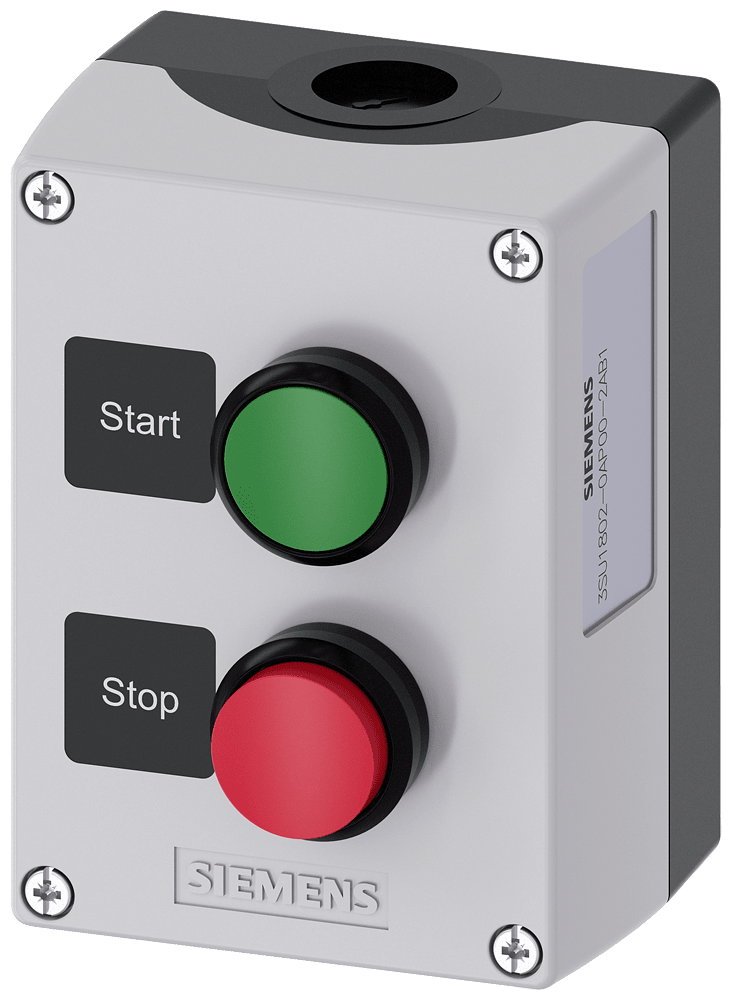 pulsantiera per dispositivi di comando, 22 mm, rotondo, materiale della pulsantiera plastica, parte superiore della custodia grigia, 2 punti di comando in plastica, B=pulsante verde, targhetta: Start, 1 NO, morsetti a vite, A=pulsante rosso, sporgente, targhetta: Stop, 1 NC, morsetti a vite, fissaggio sulla base di fondo, in alto e in basso rispettivamente 1xM20, targhette incollate Custodie SIRIUS ACT per il montaggio dei dispositivi di comando e segnalazione da 22,5 mm in caso di installazione spazialmente separata di unità di comando e quadri elettrici. Siemens offre, sotto il nome commerciale SIRIUS ACT, un portfolio esclusivo di dispositivi di comando e segnalazione con omologazioni di prodotto per il mercato mondiale in tre moderne serie di design in robusto metallo puro e plastica pregiata.L'innovativo concetto di innesto a scatto semplifica talmente il montaggio che per eseguirlo basta una sola mano e non servono attrezzi speciali. Per i fori di montaggio sono sufficienti semplici fori non scanalati, essendo già integrata una protezione antirotazione al 100 %.Grazie al grado di protezione elevato i robusti apparecchi sono adatti all'impiego industriale e in ambiente esterno. È persino possibile la pulizia con getto ad alta pressione. Né polvere, né oli, né liscivia possono comprometterne il funzionamento affidabile.Oltre che con il cablaggio standard, gli apparecchi possono essere collegati al controllore anche tramite PROFINET, AS-Interface oppure IO-Link. Potete così ridurre il vostro onere di cablaggio, minimizzare le fonti di errore e ottenere maggiore flessibilità.Il configuratore online grafico supporta in modo confortevole la scelta e l'ordinazione di singoli apparecchi, pulsantiere e iscrizioni. È disponibile una documentazione completa (ad es. manuale, dati 3D, schema di collegamento). Esecuzioni fornibili: giallo/grigio, plastica/metallo, 1-6 punti di comando, pulsantiera equipaggiabile/equipaggiata, a scelta con collegamento AS-Interface. SIRIUS ACT - Performance in Action nel comando e nella segnalazione. Semplici da montare, altamente performanti, semplicemente perfetti.