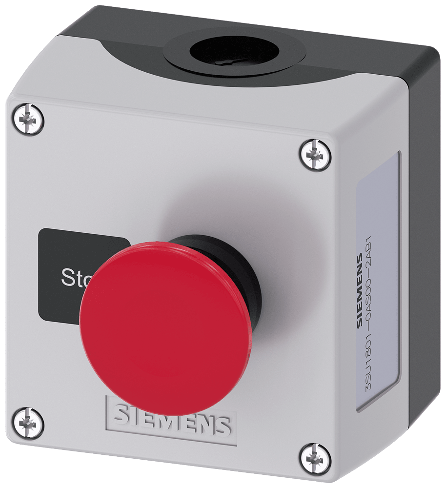 pulsantiera per dispositivi di comando 22 mm, rotondo, materiale della pulsantiera plastica, parte superiore della custodia grigia, 1 posto di comando, A=pulsante a fungo, rosso, 40mm, ad impulso, plastica, targhetta: Stop, 1 NO, 1 NC, morsetti a vite, fissaggio sulla base di fondo, in alto e in basso rispettivamente 1xM20, targhetta incollata Custodie SIRIUS ACT per il montaggio dei dispositivi di comando e segnalazione da 22,5 mm in caso di installazione spazialmente separata di unità di comando e quadri elettrici. Siemens offre, sotto il nome commerciale SIRIUS ACT, un portfolio esclusivo di dispositivi di comando e segnalazione con omologazioni di prodotto per il mercato mondiale in tre moderne serie di design in robusto metallo puro e plastica pregiata.L'innovativo concetto di innesto a scatto semplifica talmente il montaggio che per eseguirlo basta una sola mano e non servono attrezzi speciali. Per i fori di montaggio sono sufficienti semplici fori non scanalati, essendo già integrata una protezione antirotazione al 100 %.Grazie al grado di protezione elevato i robusti apparecchi sono adatti all'impiego industriale e in ambiente esterno. È persino possibile la pulizia con getto ad alta pressione. Né polvere, né oli, né liscivia possono comprometterne il funzionamento affidabile.Oltre che con il cablaggio standard, gli apparecchi possono essere collegati al controllore anche tramite PROFINET, AS-Interface oppure IO-Link. Potete così ridurre il vostro onere di cablaggio, minimizzare le fonti di errore e ottenere maggiore flessibilità.Il configuratore online grafico supporta in modo confortevole la scelta e l'ordinazione di singoli apparecchi, pulsantiere e iscrizioni. È disponibile una documentazione completa (ad es. manuale, dati 3D, schema di collegamento). Esecuzioni fornibili: giallo/grigio, plastica/metallo, 1-6 punti di comando, pulsantiera equipaggiabile/equipaggiata, a scelta con collegamento AS-Interface. SIRIUS ACT - Performance in Action nel comando e nella segnalazione. Semplici da montare, altamente performanti, semplicemente perfetti.