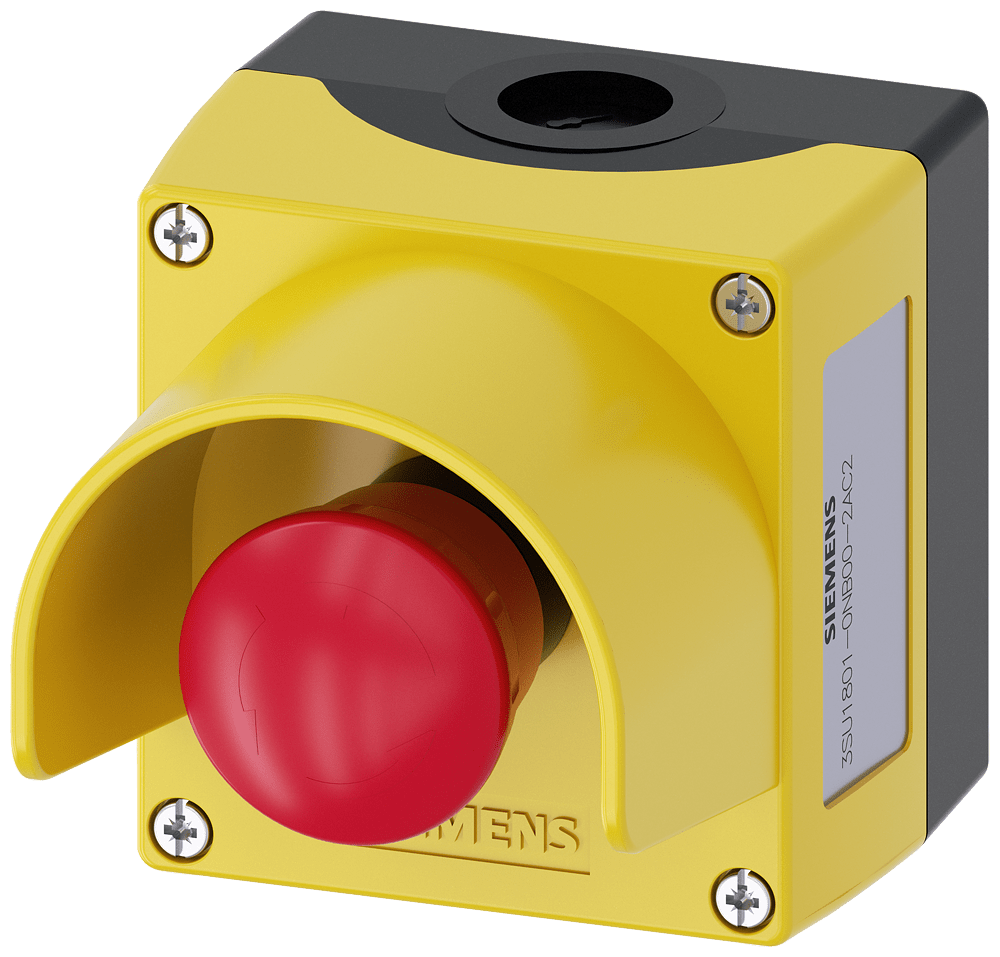 custodia per dispositivi di comando, 22 mm, rotondo, materiale della custodia plastica, parte superiore della custodia gialla, con collare di protezione, 1 punto di comando in plastica, A=pulsante a fungo di arresto di emergenza rosso, 40 mm, con sblocco a rotazione, 1 NC, 1 NC, morsetto a vite, fissaggio sulla base di fondo, in alto e in basso rispettivamente 1xM20 Custodie SIRIUS ACT per il montaggio dei dispositivi di comando e segnalazione da 22,5 mm in caso di installazione spazialmente separata di unità di comando e quadri elettrici. Siemens offre, sotto il nome commerciale SIRIUS ACT, un portfolio esclusivo di dispositivi di comando e segnalazione con omologazioni di prodotto per il mercato mondiale in tre moderne serie di design in robusto metallo puro e plastica pregiata.L'innovativo concetto di innesto a scatto semplifica talmente il montaggio che per eseguirlo basta una sola mano e non servono attrezzi speciali. Per i fori di montaggio sono sufficienti semplici fori non scanalati, essendo già integrata una protezione antirotazione al 100 %.Grazie al grado di protezione elevato i robusti apparecchi sono adatti all'impiego industriale e in ambiente esterno. È persino possibile la pulizia con getto ad alta pressione. Né polvere, né oli, né liscivia possono comprometterne il funzionamento affidabile.Oltre che con il cablaggio standard, gli apparecchi possono essere collegati al controllore anche tramite PROFINET, AS-Interface oppure IO-Link. Potete così ridurre il vostro onere di cablaggio, minimizzare le fonti di errore e ottenere maggiore flessibilità.Il configuratore online grafico supporta in modo confortevole la scelta e l'ordinazione di singoli apparecchi, pulsantiere e iscrizioni. È disponibile una documentazione completa (ad es. manuale, dati 3D, schema di collegamento). Esecuzioni fornibili: giallo/grigio, plastica/metallo, 1-6 punti di comando, pulsantiera equipaggiabile/equipaggiata, a scelta con collegamento AS-Interface. SIRIUS ACT - Performance in Action nel comando e nella segnalazione. Semplici da montare, altamente performanti, semplicemente perfetti.