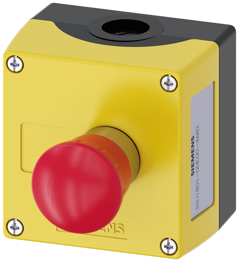 pulsantiera per dispositivi di comando 22 mm, rotondo, materiale della pulsantiera plastica, parte superiore della pulsantiera gialla, 1 posto di comando, A=pulsante a fungo di ARRESTO DI EMERGENZA rosso, in metallo, 40 mm, con sblocco a rotazione, 1 NO, 1 NC, 1 NC, morsetti a molla, fissaggio sulla base di fondo, morsetto di supporto, senza targhetta, in alto e in basso rispettivamente 1xM20 Custodie SIRIUS ACT per il montaggio dei dispositivi di comando e segnalazione da 22,5 mm in caso di installazione spazialmente separata di unità di comando e quadri elettrici. Siemens offre, sotto il nome commerciale SIRIUS ACT, un portfolio esclusivo di dispositivi di comando e segnalazione con omologazioni di prodotto per il mercato mondiale in tre moderne serie di design in robusto metallo puro e plastica pregiata.L'innovativo concetto di innesto a scatto semplifica talmente il montaggio che per eseguirlo basta una sola mano e non servono attrezzi speciali. Per i fori di montaggio sono sufficienti semplici fori non scanalati, essendo già integrata una protezione antirotazione al 100 %.Grazie al grado di protezione elevato i robusti apparecchi sono adatti all'impiego industriale e in ambiente esterno. È persino possibile la pulizia con getto ad alta pressione. Né polvere, né oli, né liscivia possono comprometterne il funzionamento affidabile.Oltre che con il cablaggio standard, gli apparecchi possono essere collegati al controllore anche tramite PROFINET, AS-Interface oppure IO-Link. Potete così ridurre il vostro onere di cablaggio, minimizzare le fonti di errore e ottenere maggiore flessibilità.Il configuratore online grafico supporta in modo confortevole la scelta e l'ordinazione di singoli apparecchi, pulsantiere e iscrizioni. È disponibile una documentazione completa (ad es. manuale, dati 3D, schema di collegamento). Esecuzioni fornibili: giallo/grigio, plastica/metallo, 1-6 punti di comando, pulsantiera equipaggiabile/equipaggiata, a scelta con collegamento AS-Interface. SIRIUS ACT - Performance in Action nel comando e nella segnalazione. Semplici da montare, altamente performanti, semplicemente perfetti.