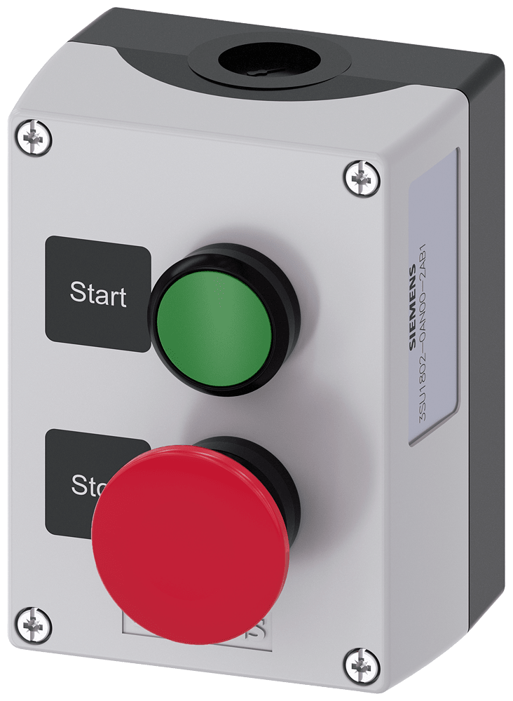 pulsantiera per dispositivi di comando, 22 mm, rotondo, materiale della pulsantiera plastica, parte superiore della custodia grigia, 2 punti di comando in plastica, B=pulsante verde, targhetta: Start, 1 NO, morsetti a vite, A=pulsante a fungo rosso, ad impulso, targhetta: Stop, 1 NC, morsetti a vite, fissaggio sulla base di fondo, in alto e in basso rispettivamente 1xM20, targhette incollate Custodie SIRIUS ACT per il montaggio dei dispositivi di comando e segnalazione da 22,5 mm in caso di installazione spazialmente separata di unità di comando e quadri elettrici. Siemens offre, sotto il nome commerciale SIRIUS ACT, un portfolio esclusivo di dispositivi di comando e segnalazione con omologazioni di prodotto per il mercato mondiale in tre moderne serie di design in robusto metallo puro e plastica pregiata.L'innovativo concetto di innesto a scatto semplifica talmente il montaggio che per eseguirlo basta una sola mano e non servono attrezzi speciali. Per i fori di montaggio sono sufficienti semplici fori non scanalati, essendo già integrata una protezione antirotazione al 100 %.Grazie al grado di protezione elevato i robusti apparecchi sono adatti all'impiego industriale e in ambiente esterno. È persino possibile la pulizia con getto ad alta pressione. Né polvere, né oli, né liscivia possono comprometterne il funzionamento affidabile.Oltre che con il cablaggio standard, gli apparecchi possono essere collegati al controllore anche tramite PROFINET, AS-Interface oppure IO-Link. Potete così ridurre il vostro onere di cablaggio, minimizzare le fonti di errore e ottenere maggiore flessibilità.Il configuratore online grafico supporta in modo confortevole la scelta e l'ordinazione di singoli apparecchi, pulsantiere e iscrizioni. È disponibile una documentazione completa (ad es. manuale, dati 3D, schema di collegamento). Esecuzioni fornibili: giallo/grigio, plastica/metallo, 1-6 punti di comando, pulsantiera equipaggiabile/equipaggiata, a scelta con collegamento AS-Interface. SIRIUS ACT - Performance in Action nel comando e nella segnalazione. Semplici da montare, altamente performanti, semplicemente perfetti.