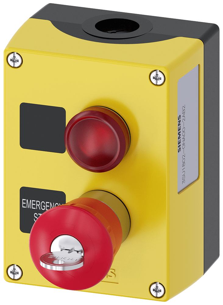 pulsantiera per dispositivi di comando 22 mm, rotondo, materiale della pulsantiera plastica, parte superiore della pulsantiera gialla, 2 punti di comando in plastica, B = indicatore luminoso, rosso, LED AC/DC 24 V,morsetti a vite, targhetta senza iscrizione, A= ARRESTO DI EMERGENZA, 40 mm, RONIS SB30, targhetta con iscrizione: EMERGENCY STOP, 1 NO, 1 NC, morsetti a vite, fissaggio sulla base di fondo, in alto e in basso rispettivamente 1xM20, targhette allegate Custodie SIRIUS ACT per il montaggio dei dispositivi di comando e segnalazione da 22,5 mm in caso di installazione spazialmente separata di unità di comando e quadri elettrici. Siemens offre, sotto il nome commerciale SIRIUS ACT, un portfolio esclusivo di dispositivi di comando e segnalazione con omologazioni di prodotto per il mercato mondiale in tre moderne serie di design in robusto metallo puro e plastica pregiata.L'innovativo concetto di innesto a scatto semplifica talmente il montaggio che per eseguirlo basta una sola mano e non servono attrezzi speciali. Per i fori di montaggio sono sufficienti semplici fori non scanalati, essendo già integrata una protezione antirotazione al 100 %.Grazie al grado di protezione elevato i robusti apparecchi sono adatti all'impiego industriale e in ambiente esterno. È persino possibile la pulizia con getto ad alta pressione. Né polvere, né oli, né liscivia possono comprometterne il funzionamento affidabile.Oltre che con il cablaggio standard, gli apparecchi possono essere collegati al controllore anche tramite PROFINET, AS-Interface oppure IO-Link. Potete così ridurre il vostro onere di cablaggio, minimizzare le fonti di errore e ottenere maggiore flessibilità.Il configuratore online grafico supporta in modo confortevole la scelta e l'ordinazione di singoli apparecchi, pulsantiere e iscrizioni. È disponibile una documentazione completa (ad es. manuale, dati 3D, schema di collegamento). Esecuzioni fornibili: giallo/grigio, plastica/metallo, 1-6 punti di comando, pulsantiera equipaggiabile/equipaggiata, a scelta con collegamento AS-Interface. SIRIUS ACT - Performance in Action nel comando e nella segnalazione. Semplici da montare, altamente performanti, semplicemente perfetti.