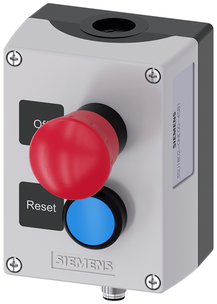 pulsantiera per dispositivi di comando, 22 mm, rotondo, materiale della pulsantiera plastica, parte superiore della pulsantiera grigia, 2 punti di comando in plastica, B= pulsante a fungo di arresto di emergenza rosso, 40 mm, con sblocco a rotazione, 2x 1 NC, targhetta nera "Off", A= pulsante, blu, 1 NO, Targhetta nera "Reset", morsetti a molla, fissaggio sulla base di fondo, connettore M12 (a 8 poli) in basso, conduttori di riserva isolati, piedinatura del connettore: pin1=11, pin2=12, pin3=21, pin4=22, pin5=13, pin6=n.c. pin7=n.c., pin8=14, due collegamenti a 2 ingress(*) Custodie SIRIUS ACT per il montaggio dei dispositivi di comando e segnalazione da 22,5 mm in caso di installazione spazialmente separata di unità di comando e quadri elettrici. Siemens offre, sotto il nome commerciale SIRIUS ACT, un portfolio esclusivo di dispositivi di comando e segnalazione con omologazioni di prodotto per il mercato mondiale in tre moderne serie di design in robusto metallo puro e plastica pregiata.L'innovativo concetto di innesto a scatto semplifica talmente il montaggio che per eseguirlo basta una sola mano e non servono attrezzi speciali. Per i fori di montaggio sono sufficienti semplici fori non scanalati, essendo già integrata una protezione antirotazione al 100 %.Grazie al grado di protezione elevato i robusti apparecchi sono adatti all'impiego industriale e in ambiente esterno. È persino possibile la pulizia con getto ad alta pressione. Né polvere, né oli, né liscivia possono comprometterne il funzionamento affidabile.Oltre che con il cablaggio standard, gli apparecchi possono essere collegati al controllore anche tramite PROFINET, AS-Interface oppure IO-Link. Potete così ridurre il vostro onere di cablaggio, minimizzare le fonti di errore e ottenere maggiore flessibilità.Il configuratore online grafico supporta in modo confortevole la scelta e l'ordinazione di singoli apparecchi, pulsantiere e iscrizioni. È disponibile una documentazione completa (ad es. manuale, dati 3D, schema di collegamento). Esecuzioni fornibili: giallo/grigio, plastica/metallo, 1-6 punti di comando, pulsantiera equipaggiabile/equipaggiata, a scelta con collegamento AS-Interface. SIRIUS ACT - Performance in Action nel comando e nella segnalazione. Semplici da montare, altamente performanti, semplicemente perfetti.