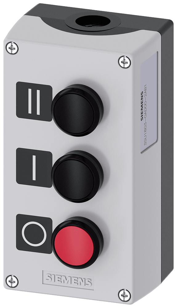 pulsantiera per dispositivi di comando, 22 mm, rotondo, materiale della pulsantiera plastica, parte superiore della pulsantiera grigia, 3 punti di comando plastica, C=pulsante nero,targhetta:II, 1 NO, morsetti a vite, B=pulsante nero, targhetta:I, 1 NO, morsetti a vite, A=pulsante rosso, targhetta: O, 1 NC, morsetti a vite, fissaggio sulla base di fondo, in alto e in basso risp. 1xM20, targhette allegate Custodie SIRIUS ACT per il montaggio dei dispositivi di comando e segnalazione da 22,5 mm in caso di installazione spazialmente separata di unità di comando e quadri elettrici. Siemens offre, sotto il nome commerciale SIRIUS ACT, un portfolio esclusivo di dispositivi di comando e segnalazione con omologazioni di prodotto per il mercato mondiale in tre moderne serie di design in robusto metallo puro e plastica pregiata.L'innovativo concetto di innesto a scatto semplifica talmente il montaggio che per eseguirlo basta una sola mano e non servono attrezzi speciali. Per i fori di montaggio sono sufficienti semplici fori non scanalati, essendo già integrata una protezione antirotazione al 100 %.Grazie al grado di protezione elevato i robusti apparecchi sono adatti all'impiego industriale e in ambiente esterno. È persino possibile la pulizia con getto ad alta pressione. Né polvere, né oli, né liscivia possono comprometterne il funzionamento affidabile.Oltre che con il cablaggio standard, gli apparecchi possono essere collegati al controllore anche tramite PROFINET, AS-Interface oppure IO-Link. Potete così ridurre il vostro onere di cablaggio, minimizzare le fonti di errore e ottenere maggiore flessibilità.Il configuratore online grafico supporta in modo confortevole la scelta e l'ordinazione di singoli apparecchi, pulsantiere e iscrizioni. È disponibile una documentazione completa (ad es. manuale, dati 3D, schema di collegamento). Esecuzioni fornibili: giallo/grigio, plastica/metallo, 1-6 punti di comando, pulsantiera equipaggiabile/equipaggiata, a scelta con collegamento AS-Interface. SIRIUS ACT - Performance in Action nel comando e nella segnalazione. Semplici da montare, altamente performanti, semplicemente perfetti.