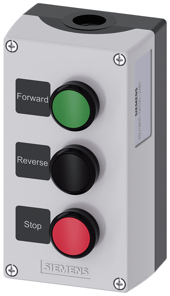 pulsantiera per dispositivi di comando, 22 mm, rotondo, materiale della pulsantiera plastica, parte superiore della custodia grigia, 3 punti di comando in plastica, C=pulsante verde, targhetta: Forward, 1 NO, 1 NC, morsetti a vite, B=pulsante nero, targhetta: Reverse, 1 NO, 1 NC, morsetti a vite, A=pulsante rosso, targhetta: Stop, 1 NO, 1 NC, morsetti a vite, fissaggio sulla base di fondo, in alto e in basso rispettivamente 1xM20, targhette incollate Custodie SIRIUS ACT per il montaggio dei dispositivi di comando e segnalazione da 22,5 mm in caso di installazione spazialmente separata di unità di comando e quadri elettrici. Siemens offre, sotto il nome commerciale SIRIUS ACT, un portfolio esclusivo di dispositivi di comando e segnalazione con omologazioni di prodotto per il mercato mondiale in tre moderne serie di design in robusto metallo puro e plastica pregiata.L'innovativo concetto di innesto a scatto semplifica talmente il montaggio che per eseguirlo basta una sola mano e non servono attrezzi speciali. Per i fori di montaggio sono sufficienti semplici fori non scanalati, essendo già integrata una protezione antirotazione al 100 %.Grazie al grado di protezione elevato i robusti apparecchi sono adatti all'impiego industriale e in ambiente esterno. È persino possibile la pulizia con getto ad alta pressione. Né polvere, né oli, né liscivia possono comprometterne il funzionamento affidabile.Oltre che con il cablaggio standard, gli apparecchi possono essere collegati al controllore anche tramite PROFINET, AS-Interface oppure IO-Link. Potete così ridurre il vostro onere di cablaggio, minimizzare le fonti di errore e ottenere maggiore flessibilità.Il configuratore online grafico supporta in modo confortevole la scelta e l'ordinazione di singoli apparecchi, pulsantiere e iscrizioni. È disponibile una documentazione completa (ad es. manuale, dati 3D, schema di collegamento). Esecuzioni fornibili: giallo/grigio, plastica/metallo, 1-6 punti di comando, pulsantiera equipaggiabile/equipaggiata, a scelta con collegamento AS-Interface. SIRIUS ACT - Performance in Action nel comando e nella segnalazione. Semplici da montare, altamente performanti, semplicemente perfetti.