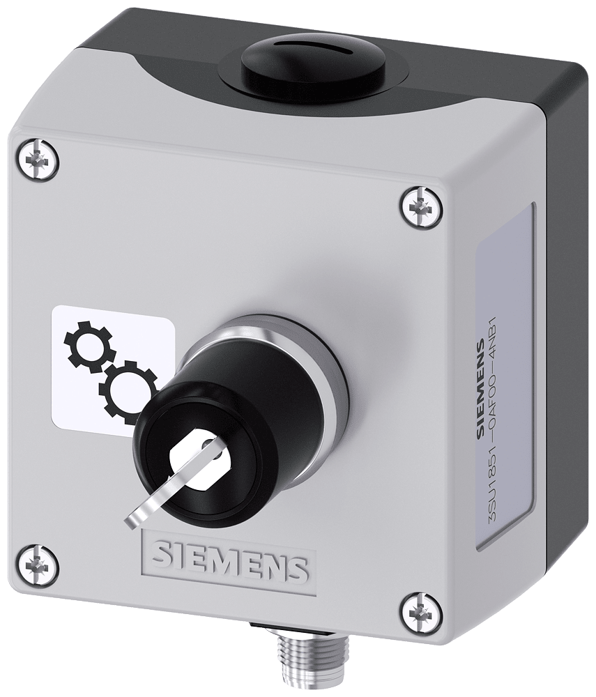 custodia per dispositivi di comando, 22 mm, rotondo, materiale della pulsantiera metallo, parte superiore della pulsantiera grigia, 1 punto di comando in metallo, A=Siemens, selettore a chiave C SSG10 estrazione O+I, 1NO, morsetti a molla, fissaggio sulla base di fondo, targhetta argento, iscrizione in nero, con simbolo grafico: ruota dentata, connettore M12 (a 5 poli) in basso, conduttori di riserva isolati targhetta incollata Custodie SIRIUS ACT per il montaggio dei dispositivi di comando e segnalazione da 22,5 mm in caso di installazione spazialmente separata di unità di comando e quadri elettrici. Siemens offre, sotto il nome commerciale SIRIUS ACT, un portfolio esclusivo di dispositivi di comando e segnalazione con omologazioni di prodotto per il mercato mondiale in tre moderne serie di design in robusto metallo puro e plastica pregiata.L'innovativo concetto di innesto a scatto semplifica talmente il montaggio che per eseguirlo basta una sola mano e non servono attrezzi speciali. Per i fori di montaggio sono sufficienti semplici fori non scanalati, essendo già integrata una protezione antirotazione al 100 %.Grazie al grado di protezione elevato i robusti apparecchi sono adatti all'impiego industriale e in ambiente esterno. È persino possibile la pulizia con getto ad alta pressione. Né polvere, né oli, né liscivia possono comprometterne il funzionamento affidabile.Oltre che con il cablaggio standard, gli apparecchi possono essere collegati al controllore anche tramite PROFINET, AS-Interface oppure IO-Link. Potete così ridurre il vostro onere di cablaggio, minimizzare le fonti di errore e ottenere maggiore flessibilità.Il configuratore online grafico supporta in modo confortevole la scelta e l'ordinazione di singoli apparecchi, pulsantiere e iscrizioni. È disponibile una documentazione completa (ad es. manuale, dati 3D, schema di collegamento). Esecuzioni fornibili: giallo/grigio, plastica/metallo, 1-6 punti di comando, pulsantiera equipaggiabile/equipaggiata, a scelta con collegamento AS-Interface. SIRIUS ACT - Performance in Action nel comando e nella segnalazione. Semplici da montare, altamente performanti, semplicemente perfetti.