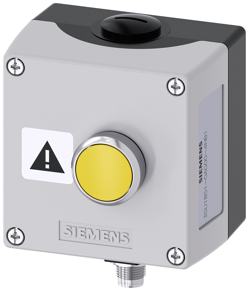 pulsantiera per dispositivi di comando, 22 mm, rotondo, materiale della pulsantiera metallo, parte superiore della pulsantiera grigia, 1 punto di comando in metallo, A=pulsante giallo, 1 NO, morsetti a molla, fissaggio sulla base di fondo, targhetta argento, iscrizione nera, con simbolo grafico: ERROR, connettore M12 (a 5 poli) in basso, conduttori di riserva isolati targhetta incollata Custodie SIRIUS ACT per il montaggio dei dispositivi di comando e segnalazione da 22,5 mm in caso di installazione spazialmente separata di unità di comando e quadri elettrici. Siemens offre, sotto il nome commerciale SIRIUS ACT, un portfolio esclusivo di dispositivi di comando e segnalazione con omologazioni di prodotto per il mercato mondiale in tre moderne serie di design in robusto metallo puro e plastica pregiata.L'innovativo concetto di innesto a scatto semplifica talmente il montaggio che per eseguirlo basta una sola mano e non servono attrezzi speciali. Per i fori di montaggio sono sufficienti semplici fori non scanalati, essendo già integrata una protezione antirotazione al 100 %.Grazie al grado di protezione elevato i robusti apparecchi sono adatti all'impiego industriale e in ambiente esterno. È persino possibile la pulizia con getto ad alta pressione. Né polvere, né oli, né liscivia possono comprometterne il funzionamento affidabile.Oltre che con il cablaggio standard, gli apparecchi possono essere collegati al controllore anche tramite PROFINET, AS-Interface oppure IO-Link. Potete così ridurre il vostro onere di cablaggio, minimizzare le fonti di errore e ottenere maggiore flessibilità.Il configuratore online grafico supporta in modo confortevole la scelta e l'ordinazione di singoli apparecchi, pulsantiere e iscrizioni. È disponibile una documentazione completa (ad es. manuale, dati 3D, schema di collegamento). Esecuzioni fornibili: giallo/grigio, plastica/metallo, 1-6 punti di comando, pulsantiera equipaggiabile/equipaggiata, a scelta con collegamento AS-Interface. SIRIUS ACT - Performance in Action nel comando e nella segnalazione. Semplici da montare, altamente performanti, semplicemente perfetti.