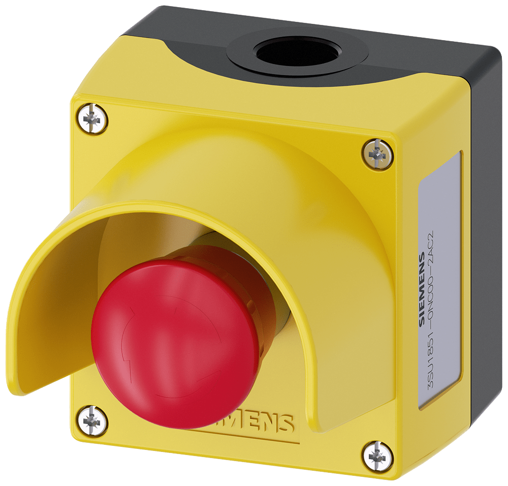 pulsantiera per dispositivi di comando 22 mm, rotondi, materiale della pulsantiera metallo, parte superiore della pulsantiera gialla, con collare di protezione, 1 punto di comando in metallo, A=pulsante a fungo di ARRESTO di EMERGENZA,rosso, 40 mm, con sblocco a rotazione, 1 NC, 1 NC, contatti dorati, morsetti a vite, fissaggio sulla base di fondo, in alto e in basso rispettivamente 1xM20 Custodie SIRIUS ACT per il montaggio dei dispositivi di comando e segnalazione da 22,5 mm in caso di installazione spazialmente separata di unità di comando e quadri elettrici. Siemens offre, sotto il nome commerciale SIRIUS ACT, un portfolio esclusivo di dispositivi di comando e segnalazione con omologazioni di prodotto per il mercato mondiale in tre moderne serie di design in robusto metallo puro e plastica pregiata.L'innovativo concetto di innesto a scatto semplifica talmente il montaggio che per eseguirlo basta una sola mano e non servono attrezzi speciali. Per i fori di montaggio sono sufficienti semplici fori non scanalati, essendo già integrata una protezione antirotazione al 100 %.Grazie al grado di protezione elevato i robusti apparecchi sono adatti all'impiego industriale e in ambiente esterno. È persino possibile la pulizia con getto ad alta pressione. Né polvere, né oli, né liscivia possono comprometterne il funzionamento affidabile.Oltre che con il cablaggio standard, gli apparecchi possono essere collegati al controllore anche tramite PROFINET, AS-Interface oppure IO-Link. Potete così ridurre il vostro onere di cablaggio, minimizzare le fonti di errore e ottenere maggiore flessibilità.Il configuratore online grafico supporta in modo confortevole la scelta e l'ordinazione di singoli apparecchi, pulsantiere e iscrizioni. È disponibile una documentazione completa (ad es. manuale, dati 3D, schema di collegamento). Esecuzioni fornibili: giallo/grigio, plastica/metallo, 1-6 punti di comando, pulsantiera equipaggiabile/equipaggiata, a scelta con collegamento AS-Interface. SIRIUS ACT - Performance in Action nel comando e nella segnalazione. Semplici da montare, altamente performanti, semplicemente perfetti.