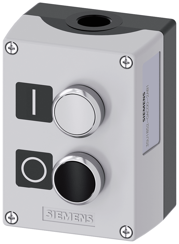 pulsantiera per dispositivi di comando, 22 mm, rotondo, materiale della pulsantiera metallo, parte superiore della pulsantiera grigia, 2 punti di comando in metallo, B=pulsante bianco, targhetta: I, 1 NO, morsetti a vite, A=pulsante nero,targhetta:O, 1 NC, morsetti a vite, fissaggio sulla base di fondo, in alto e in basso risp. 1xM20, targhette allegate Custodie SIRIUS ACT per il montaggio dei dispositivi di comando e segnalazione da 22,5 mm in caso di installazione spazialmente separata di unità di comando e quadri elettrici. Siemens offre, sotto il nome commerciale SIRIUS ACT, un portfolio esclusivo di dispositivi di comando e segnalazione con omologazioni di prodotto per il mercato mondiale in tre moderne serie di design in robusto metallo puro e plastica pregiata.L'innovativo concetto di innesto a scatto semplifica talmente il montaggio che per eseguirlo basta una sola mano e non servono attrezzi speciali. Per i fori di montaggio sono sufficienti semplici fori non scanalati, essendo già integrata una protezione antirotazione al 100 %.Grazie al grado di protezione elevato i robusti apparecchi sono adatti all'impiego industriale e in ambiente esterno. È persino possibile la pulizia con getto ad alta pressione. Né polvere, né oli, né liscivia possono comprometterne il funzionamento affidabile.Oltre che con il cablaggio standard, gli apparecchi possono essere collegati al controllore anche tramite PROFINET, AS-Interface oppure IO-Link. Potete così ridurre il vostro onere di cablaggio, minimizzare le fonti di errore e ottenere maggiore flessibilità.Il configuratore online grafico supporta in modo confortevole la scelta e l'ordinazione di singoli apparecchi, pulsantiere e iscrizioni. È disponibile una documentazione completa (ad es. manuale, dati 3D, schema di collegamento). Esecuzioni fornibili: giallo/grigio, plastica/metallo, 1-6 punti di comando, pulsantiera equipaggiabile/equipaggiata, a scelta con collegamento AS-Interface. SIRIUS ACT - Performance in Action nel comando e nella segnalazione. Semplici da montare, altamente performanti, semplicemente perfetti.