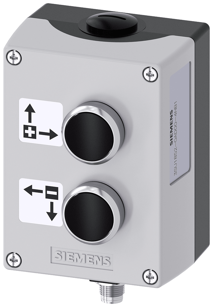 custodia per dispositivi di comando, 22 mm, rotondo, materiale della custodia metallo, parte superiore della custodia grigia, 2 punti di comando in metallo, B=pulsante nero, 1 NO, morsetti a molla, fissaggio sulla base di fondo, targhetta argento, caratteri neri, con simbolo grafico: AVANTI SU PIÙ, A=pulsante nero, 1 NO, morsetti a molla, fissaggio sulla base di fondo, targhetta argento, caratteri neri, con simbolo grafico: INDIETRO, IN BASSO, MENO, connettore M12, (a 5 poli) in basso, conduttori di riserva isolati, targhette incollate Custodie SIRIUS ACT per il montaggio dei dispositivi di comando e segnalazione da 22,5 mm in caso di installazione spazialmente separata di unità di comando e quadri elettrici. Siemens offre, sotto il nome commerciale SIRIUS ACT, un portfolio esclusivo di dispositivi di comando e segnalazione con omologazioni di prodotto per il mercato mondiale in tre moderne serie di design in robusto metallo puro e plastica pregiata.L'innovativo concetto di innesto a scatto semplifica talmente il montaggio che per eseguirlo basta una sola mano e non servono attrezzi speciali. Per i fori di montaggio sono sufficienti semplici fori non scanalati, essendo già integrata una protezione antirotazione al 100 %.Grazie al grado di protezione elevato i robusti apparecchi sono adatti all'impiego industriale e in ambiente esterno. È persino possibile la pulizia con getto ad alta pressione. Né polvere, né oli, né liscivia possono comprometterne il funzionamento affidabile.Oltre che con il cablaggio standard, gli apparecchi possono essere collegati al controllore anche tramite PROFINET, AS-Interface oppure IO-Link. Potete così ridurre il vostro onere di cablaggio, minimizzare le fonti di errore e ottenere maggiore flessibilità.Il configuratore online grafico supporta in modo confortevole la scelta e l'ordinazione di singoli apparecchi, pulsantiere e iscrizioni. È disponibile una documentazione completa (ad es. manuale, dati 3D, schema di collegamento). Esecuzioni fornibili: giallo/grigio, plastica/metallo, 1-6 punti di comando, pulsantiera equipaggiabile/equipaggiata, a scelta con collegamento AS-Interface. SIRIUS ACT - Performance in Action nel comando e nella segnalazione. Semplici da montare, altamente performanti, semplicemente perfetti.