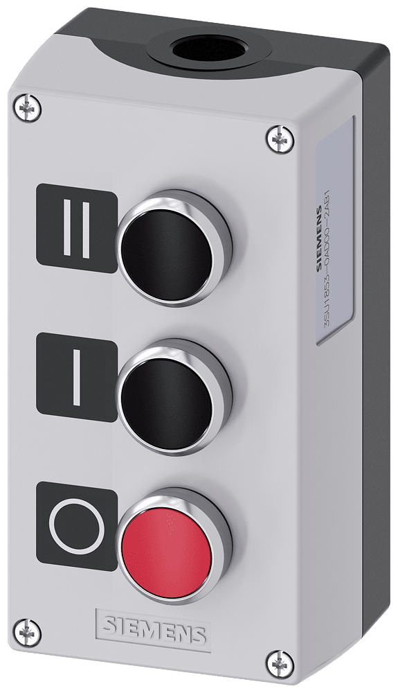 pulsantiera per dispositivi di comando, 22 mm, rotondo, materiale della pulsantiera metallo, parte superiore della pulsantiera grigia, 3 punti di comando in metallo, C=pulsante nero,targhetta:II, 1 NO, morsetti a vite, B=pulsante nero,targhetta I, 1 NO, morsetti a vite, A=pulsante rosso, targhetta: O, 1 NC, morsetti a vite, fissaggio sulla base di fondo, in alto e in basso risp. 1xM20, targhette allegate Custodie SIRIUS ACT per il montaggio dei dispositivi di comando e segnalazione da 22,5 mm in caso di installazione spazialmente separata di unità di comando e quadri elettrici. Siemens offre, sotto il nome commerciale SIRIUS ACT, un portfolio esclusivo di dispositivi di comando e segnalazione con omologazioni di prodotto per il mercato mondiale in tre moderne serie di design in robusto metallo puro e plastica pregiata.L'innovativo concetto di innesto a scatto semplifica talmente il montaggio che per eseguirlo basta una sola mano e non servono attrezzi speciali. Per i fori di montaggio sono sufficienti semplici fori non scanalati, essendo già integrata una protezione antirotazione al 100 %.Grazie al grado di protezione elevato i robusti apparecchi sono adatti all'impiego industriale e in ambiente esterno. È persino possibile la pulizia con getto ad alta pressione. Né polvere, né oli, né liscivia possono comprometterne il funzionamento affidabile.Oltre che con il cablaggio standard, gli apparecchi possono essere collegati al controllore anche tramite PROFINET, AS-Interface oppure IO-Link. Potete così ridurre il vostro onere di cablaggio, minimizzare le fonti di errore e ottenere maggiore flessibilità.Il configuratore online grafico supporta in modo confortevole la scelta e l'ordinazione di singoli apparecchi, pulsantiere e iscrizioni. È disponibile una documentazione completa (ad es. manuale, dati 3D, schema di collegamento). Esecuzioni fornibili: giallo/grigio, plastica/metallo, 1-6 punti di comando, pulsantiera equipaggiabile/equipaggiata, a scelta con collegamento AS-Interface. SIRIUS ACT - Performance in Action nel comando e nella segnalazione. Semplici da montare, altamente performanti, semplicemente perfetti.