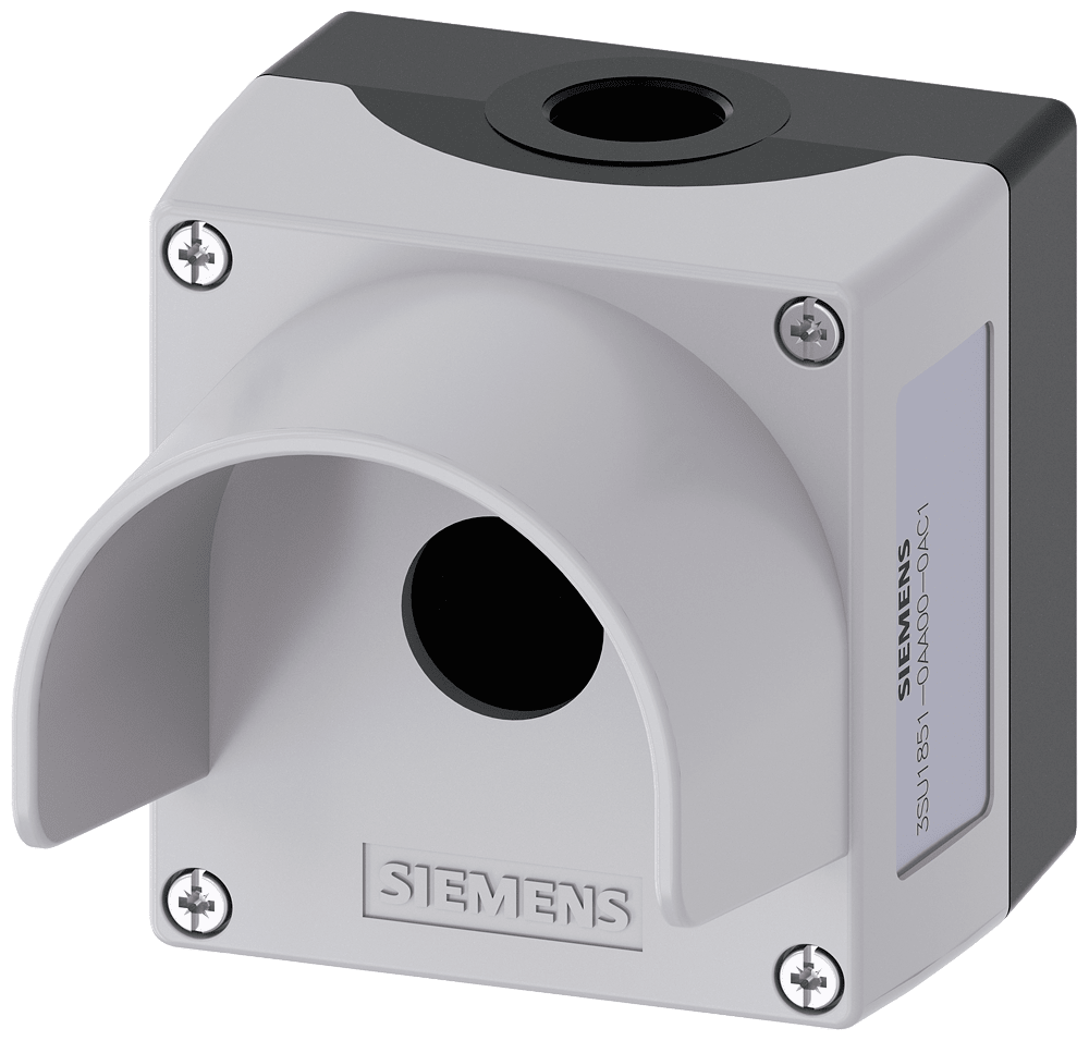 Pulsantiera per dispositivi di comando, 22 mm, rotondo, materiale della custodia metallo, parte superiore della custodia grigia, con collare di protezione, 1 posto di comando, senza equipaggiamento, fissaggio sulla base di fondo, in alto e in basso rispettivamente 1xM20 Custodie SIRIUS ACT per il montaggio dei dispositivi di comando e segnalazione da 22,5 mm in caso di installazione spazialmente separata di unità di comando e quadri elettrici. Siemens offre, sotto il nome commerciale SIRIUS ACT, un portfolio esclusivo di dispositivi di comando e segnalazione con omologazioni di prodotto per il mercato mondiale in tre moderne serie di design in robusto metallo puro e plastica pregiata.L'innovativo concetto di innesto a scatto semplifica talmente il montaggio che per eseguirlo basta una sola mano e non servono attrezzi speciali. Per i fori di montaggio sono sufficienti semplici fori non scanalati, essendo già integrata una protezione antirotazione al 100 %.Grazie al grado di protezione elevato i robusti apparecchi sono adatti all'impiego industriale e in ambiente esterno. È persino possibile la pulizia con getto ad alta pressione. Né polvere, né oli, né liscivia possono comprometterne il funzionamento affidabile.Oltre che con il cablaggio standard, gli apparecchi possono essere collegati al controllore anche tramite PROFINET, AS-Interface oppure IO-Link. Potete così ridurre il vostro onere di cablaggio, minimizzare le fonti di errore e ottenere maggiore flessibilità.Il configuratore online grafico supporta in modo confortevole la scelta e l'ordinazione di singoli apparecchi, pulsantiere e iscrizioni. È disponibile una documentazione completa (ad es. manuale, dati 3D, schema di collegamento). Esecuzioni fornibili: giallo/grigio, plastica/metallo, 1-6 punti di comando, pulsantiera equipaggiabile/equipaggiata, a scelta con collegamento AS-Interface. SIRIUS ACT - Performance in Action nel comando e nella segnalazione. Semplici da montare, altamente performanti, semplicemente perfetti.