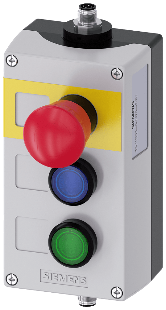 pulsantiera per dispositivi di comando, 22 mm, rotondo, materiale della pulsantiera plastica, parte superiore della pulsantiera grigia, 3 punti di comando in plastica, rientranza per targhette, equipaggiamento personalizzato, modulo di elettronica per IO-Link, morsetti a molla, fissaggio sulla base di fondo, arresto di emergenza convenzionale, connettore M12 a 5 poli in alto, assegnazione dei pin: PIN1=21, PIN2=11, PIN3=n.c., PIN4=22, PIN5=12, connettore M12 a 5 poli in basso, cablaggio IO-Link: PIN1=L+, PIN3=L-, PIN4=C/Q1, targhetta con dicitura per Arresto di(*) Custodie SIRIUS ACT per il montaggio dei dispositivi di comando e segnalazione da 22,5 mm in caso di installazione spazialmente separata di unità di comando e quadri elettrici. Siemens offre, sotto il nome commerciale SIRIUS ACT, un portfolio esclusivo di dispositivi di comando e segnalazione con omologazioni di prodotto per il mercato mondiale in tre moderne serie di design in robusto metallo puro e plastica pregiata.L'innovativo concetto di innesto a scatto semplifica talmente il montaggio che per eseguirlo basta una sola mano e non servono attrezzi speciali. Per i fori di montaggio sono sufficienti semplici fori non scanalati, essendo già integrata una protezione antirotazione al 100 %.Grazie al grado di protezione elevato i robusti apparecchi sono adatti all'impiego industriale e in ambiente esterno. È persino possibile la pulizia con getto ad alta pressione. Né polvere, né oli, né liscivia possono comprometterne il funzionamento affidabile.Oltre che con il cablaggio standard, gli apparecchi possono essere collegati al controllore anche tramite PROFINET, AS-Interface oppure IO-Link. Potete così ridurre il vostro onere di cablaggio, minimizzare le fonti di errore e ottenere maggiore flessibilità.Il configuratore online grafico supporta in modo confortevole la scelta e l'ordinazione di singoli apparecchi, pulsantiere e iscrizioni. È disponibile una documentazione completa (ad es. manuale, dati 3D, schema di collegamento). Esecuzioni fornibili: giallo/grigio, plastica/metallo, 1-6 punti di comando, pulsantiera equipaggiabile/equipaggiata, a scelta con collegamento AS-Interface. SIRIUS ACT - Performance in Action nel comando e nella segnalazione. Semplici da montare, altamente performanti, semplicemente perfetti.