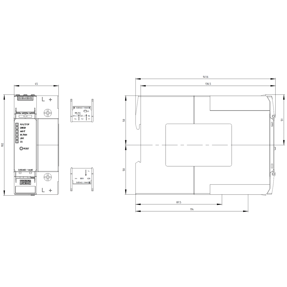 SIEMENS - Relè di controllo del carico DC per PROFINET, max. 1x63 A, max. 800 V, DC 24 V, 45 mm