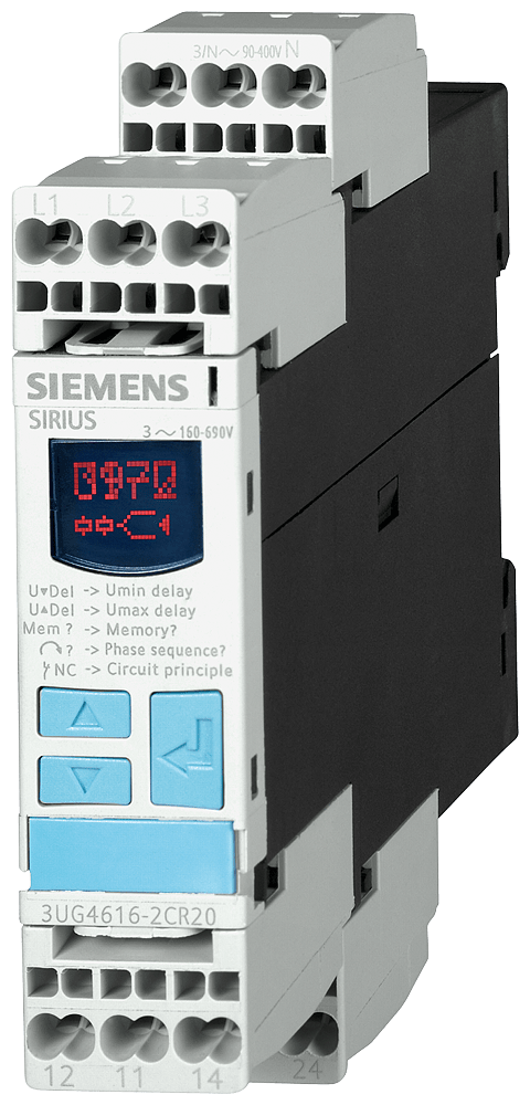 !!! Prodotto di fine serie !!! il il successore consigliato è 3UG5616-2CR20 sequenza e mancanza di fase 3x160...690V a molla relè di controllo digitale per tens. trifase con conduttore di neutro sequenza delle fasi attivabile mancanza di fase 3 x 90 fino a 400 V AC 50...60 Hz sottotensione e sovratensione 90-400V isteresi 1-20 V risp. 0-20 s per Umin e Umax 1 CO per Umin 1 CO per Umax morsetti a molla Relè di controllo rete regolabile in modo digitale SIRIUS 3UG4 per la sorveglianza di sequenza, mancanza e asimmetria delle fasi nonché di sottotensione e sovratensione, ad es. in caso di reti instabili o di impianti mobili come compressori climatizzatori, container frigoriferi, compressori da cantiere o gru. Impiego in tutto il mondo grazie all'ampio campo di tensione di alimentazione e ai certificati internazionali. Il relè può essere impostato a scelta sul superamento di valore limite in positivo o in negativo oppure sul controllo a finestra. Tempi di ritardo e comportamento di RESET parametrizzabili a piacere. Fabbisogno di spazio ridotto nel quadro elettrico grazie alla larghezza costruttiva stretta. Diagnostica affidabile grazie alla visualizzazione di valore reale e tipo di errore di rete. Tutte le esecuzioni con morsetti di collegamento rimovibili. Gli apparecchi sono disponibili oltre che con morsetti a vite anche con morsetti a molla per un collegamento rapido, esente da manutenzione e resistente alle vibrazioni. Essi sono inoltre fornibili in diverse tensioni, a scelta con IO-Link o con correzione automatica del senso di rotazione. I molteplici accessori, come ad es. targhette identificative degli apparecchi, piastrine di fissaggio e calotte di copertura, sono uniformi per tutti i relè. Relè SIRIUS - un programma per ogni evenienza.