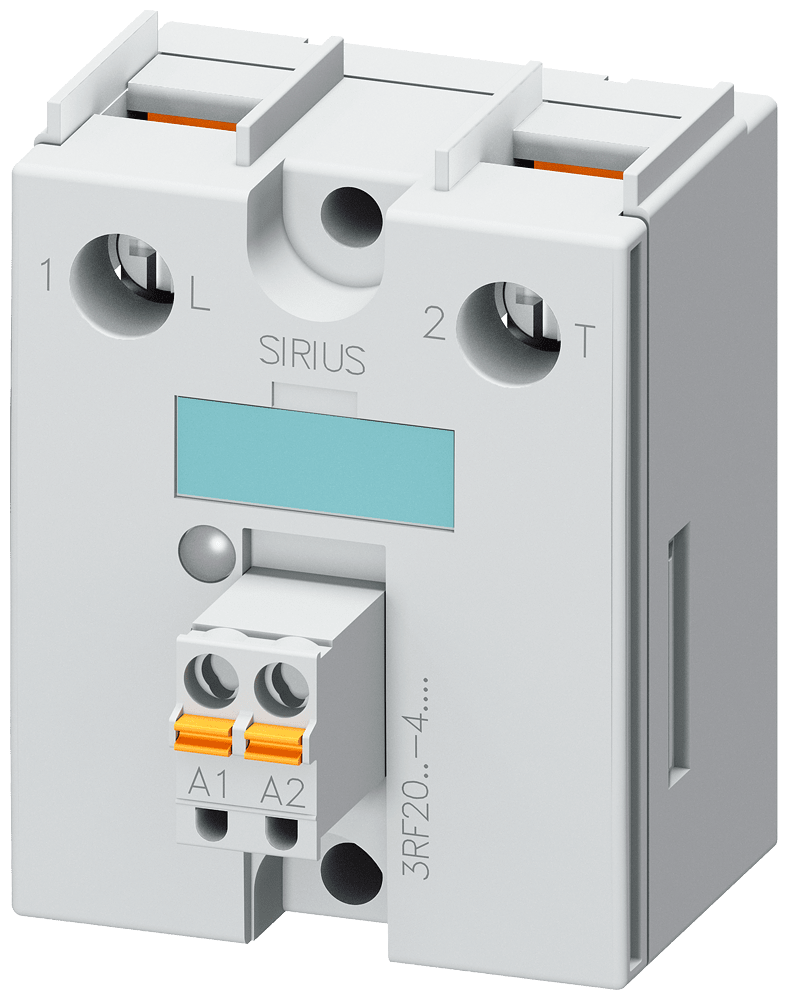 relè statico, monofase 3RF2 larghezza costruttiva 45 mm; 50 A 24 ... 230 V / DC 24 V morsetto a vite connettore di comando a molla relè statico SIRIUS 3RF20 per il comando di carichi ohmici/induttivi, ad es. di elementi riscaldanti o di valvole in un impianto di imbottigliamento. La commutazione silenziosa e senza usura degli apparecchi li rende ideali per l'impiego in ambienti sensibili al rumore (uffici, ospedali). Essi sono estremamente affidabili anche in caso di frequenze di commutazione elevate. La forma costruttiva compatta fa risparmiare spazio sulla superficie dissipatrice. I relè statici possono essere inoltre ampliati mediante i moduli funzionali standardizzati 3RF29 per molteplici applicazioni con un semplice montaggio a scatto. Gli apparecchi hanno omologazioni internazionali (ad es. IEC e UL/CSA). I relè statici sono disponibili come apparecchi monofase in due larghezze costruttive o come apparecchi trifase. Essi sono fornibili per diverse potenze e tensioni nominali di impiego. Progettati per comando in AC o DC, essi sono disponibili con morsetti a vite, a molla o per capicorda ad occhiello. Come accessori sono disponibili oltre ai moduli funzionali 3RF29 anche spine di controllo e calotte coprimorsetti. Semplice, efficiente, sempre attuale - il sistema modulare SIRIUS.