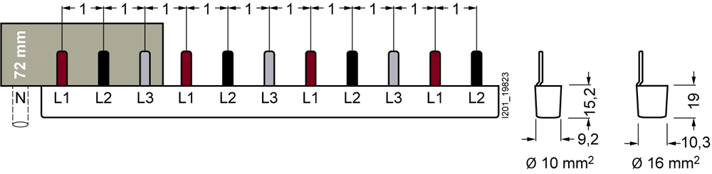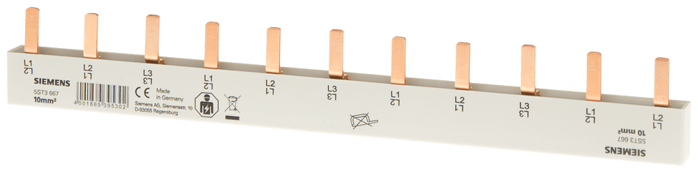 SIEMENS - sbarra di collegamento a punte, 10 mm2 collegamento: trifase/+ 8x fase protetto contro i contatti accidentali per 1 interruttore differenziale, a 4... 5ST3667