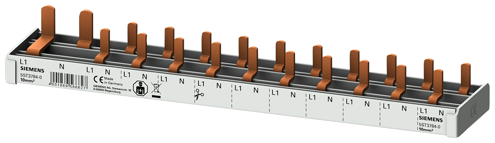 SIEMENS - Sbarra di collegamento a punte 10mm², bifase, 1x (1 fase+N) + 10x (1 fase+N), 215mm sezionabile 5ST37840