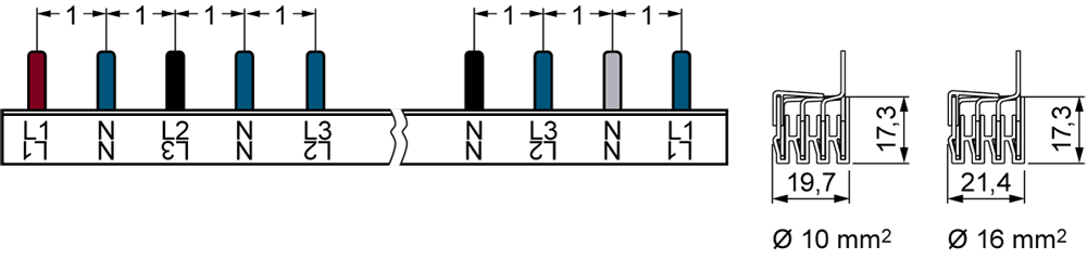 SIEMENS - Sbarra di collegamento a punte 10mm², quadrifase, 28x (1 fase+N), 1000mm sezionabile