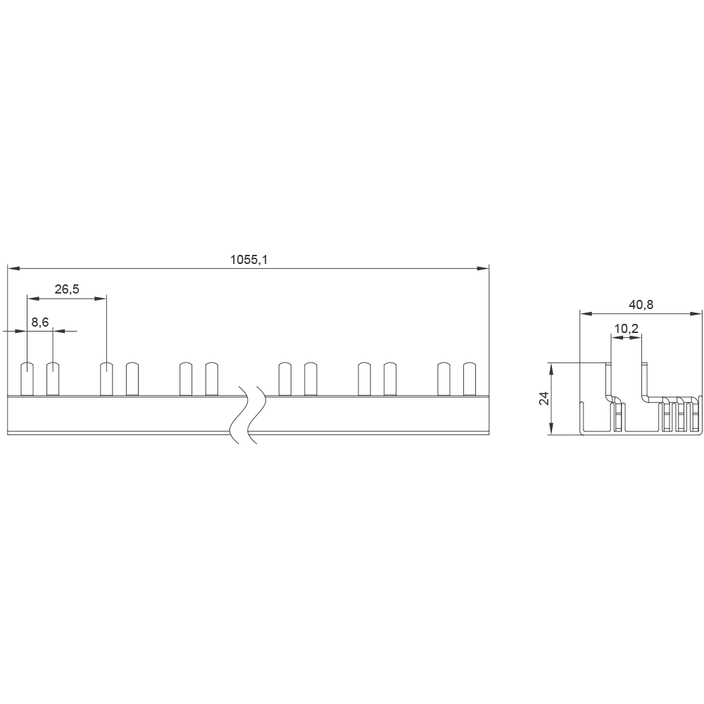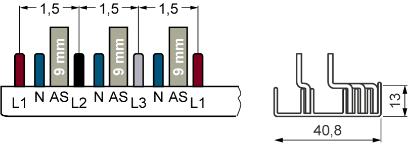 SIEMENS - Sbarra di collegamento a punte 10mm², quadrifase, 40x (1 fase+N+AUX), 1055mm sezionabile 5ST37770