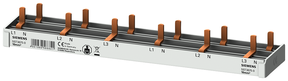 sbarra di collegamento a punte compatta 10 mm2 collegamento a 3 poli/N 6x AFDD 5SM6 + 6x apparecchio compatto 1 UM protezione contro i contatti accidentali 12 UM lunghezza fissa sbarra di collegamento a punte SENTRON 5ST3 come componente aggiuntivo per dispositivi differenziali e interruttori magnetotermici. Questi componenti aggiuntivi sono universalmente montabili. Sono facili e comodi da montare e collegare. Grazie alla protezione contro i contatti accidentali di serie, la sicurezza è garantita in modo affidabile durante l'installazione. Tecnica ottimale per la vostra sicurezza - solo da Siemens.