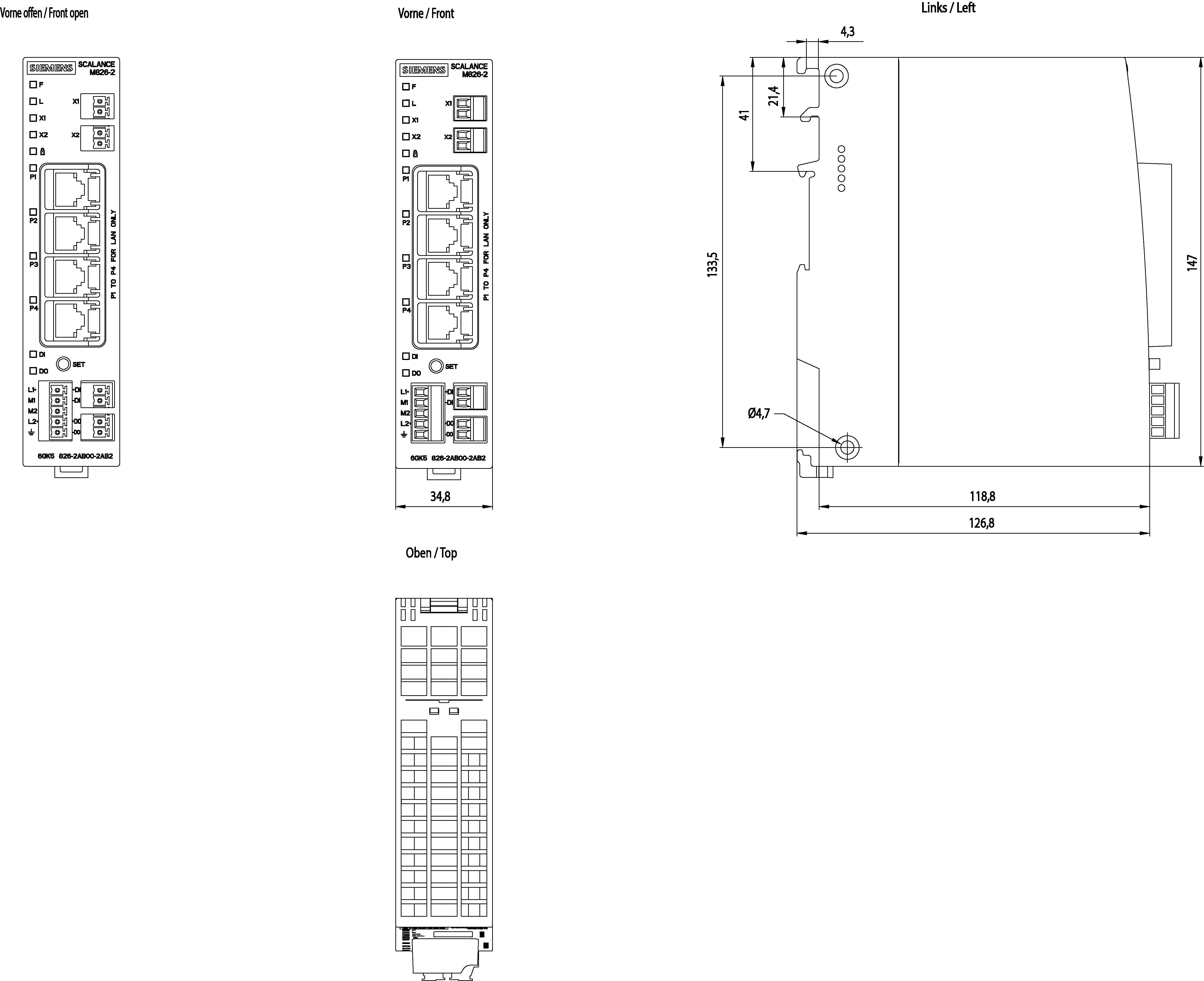 router SHDSL SCALANCE M826-2; per la comunicazione IP tramite cavi a 2 e 4 conduttori di apparecchiature di automazione basate su Ethernet ; topologia SHDSL: punto a punto, bonding, linea Bridge Mode; Routing Mode con VPN, firewall, NAT; switch a 4 porte; 1x ingresso digit., 1x uscita digit. SCALANCERouterM826-2 SHDSLtopologia SHDSL: punto a punto, Bonding, Line Bridge Mode, Routing Mode con VPN, firewall, velocità di trasmissione: 10 Mbit/s, 100 Mbit/s, con trasmissione SHDSL max. 15,3 Mbit/s, switch a 4 porte (RJ45), NAT, 1x ingresso digitale, 1x uscita digitale, morsettiera, grado di protezione IP20.modem SHDSL per la comunicazione IP tramite cavi a 2 fili e a 4 fili di sottoreti basate su Ethernet e controllori programmabili.modem SHDSL per il collegamento economico e sicuro di sottoreti basate su Ethernet e apparecchiature di automazione tramite cavi a due o più conduttori. Adatto all'impiego nell'industria e nei settori connessi all'industria.Elevati standard di sicurezza con firewall (stateful packet inspection) e collegamenti VPN (IPSec) come parte integrante del concetto di Industrial Security. L'apparecchiatura supporta lo standard ITU-T G.991.2 o SHDSL.biz (Single-pair high-speed digital subscriber line). Per la vostra protezione dell'investimento: possibilità di ulteriore utilizzo diinfrastrutture cablate esistenti per la trasmissione di Ethernet fino a distanze di almeno 10 km Ampio campo d'impiego grazie alla notevole larghezza di banda, alla performance e alla velocità.Accessori come supporti di memoria rimovibile C-Plug e Key-Plug, piedistallo per montaggio su tavolo, connettori FastConnect, diversi cavi e telai di montaggio, completano perfettamente il prodotto.
