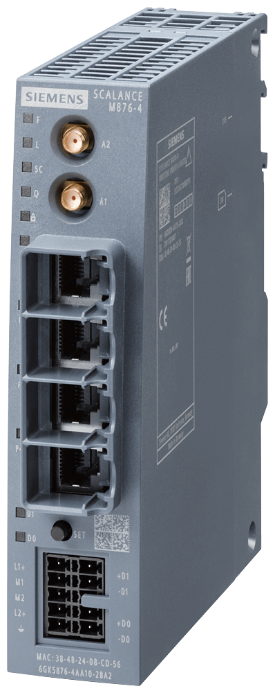 router 4G SCALANCE M876-4; per la comunicazione IP wireless di apparecchiature di automazione basate su Ethernet tramite LTE ottimizzato per reti radiomobili (4G) per l'utilizzo a livello mondiale, VPN, firewall, NAT; switch a 4 porte; 2x antenne SMA, tecnologia MIMO; 1x ingresso digit., 1x uscita digit.; osservare le omologazioni nazionali! SCALANCE M876-4 router 4G; per la comunicazione IP wireless di controllori programmabili basati su Ethernet mediante la trasmissione radiomobile LTE (4G) ottimizzata per l'utilizzo in tutto il mondo, VPN, firewall, NAT; switch a 4 porte; 2x antenna SMA, MIMO Technology; 1x ingresso digitale, 1x uscita digitale; osservare le omologazioni nazionali!