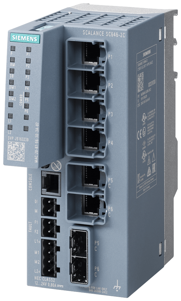 SCALANCE SC646-2C Industrial Security Appliance; per la protezione di apparecchi e reti nella produzione discreta e nell'industria di processo per la sicurezza della comunicazione industriale con firewall e VPN; ulteriori funzioni: conversione di indirizzo (NAT/NAPT); collegamento a SINEMA RC; 4x porte elettriche 10/100/1000 Mbit/s RJ45 e 2x porte Combo elettriche oppure ottiche; RJ45 da 10/100/1000 Mbit/s o 100 Mbit/s SFP o 1000 Mbit/s SFP. SCALANCE SC646-2C 4x porte RJ45 elettriche da 10/100/1000 Mbit/s e 2x porte combo elettriche o ottiche, porta RJ45 da 10/100/1000 Mbit/s o porta SFP da 100 Mbit/s o porta SFP da 1000 Mbit/s, conversione d'indirizzo (NAT/NAPT), collegamento a SINEMA RC. Per la protezione di apparecchiature e reti nella produzione discreta e nell'industria di processo, e per la protezione della comunicazione industriale tramite firewall e VPN. SCALANCE S è perfettamente adatto all'impiego nell'ambiente di automazione e/o nelcampo industriale e soddisfa le speciali esigenze della tecnica di automazione come ad es. il semplice upgrade di impianti esistenti, la facile installabilità o i minimi tempi di fermo in caso di guasto. Protezione di reti di automazione industriali da accessi non autorizzati e realizzazione di una DMZ (area protetta). Possibilità di scambio dati con altre reti senza dovere concedere l'accesso diretto alla rete dell'impianto di produzione. Controllo e filtraggio del traffico dati grazie a firewall integrati e pertanto protezione contro operazioni errate, impedimento di accessi non autorizzati, prevenzione di guasti e sovraccarico di comunicazione. Integrazione senza problemi in reti già esistenti senza riconfigurazione di nodi terminali o realizzazione di nuove sottoreti IP. Protezione completa grazie a un concetto di protezione flessibile della cella. Gli apparecchi sono robusti e realizzati per l'impiego industriale. Fanno parte degli accessori tra l'altro un'ampia gamma di software, supporti di memoria rimovibili, connettori FastConnect, attrezzi spelafili, transceiver a innesto e cavi che completano perfettamente il sistema.
