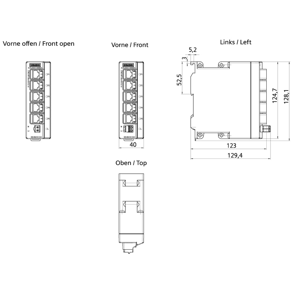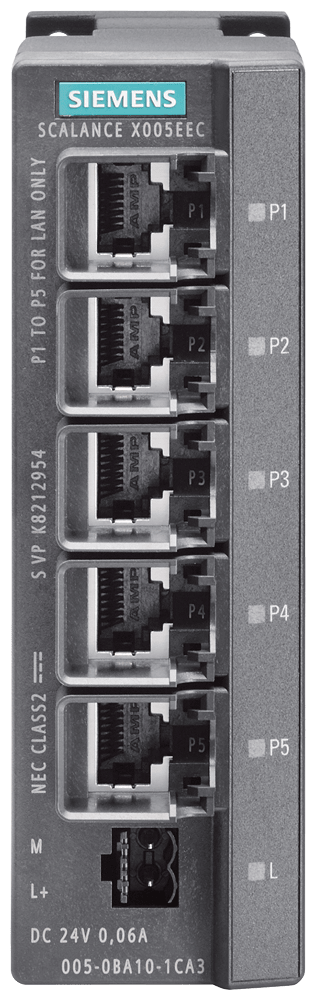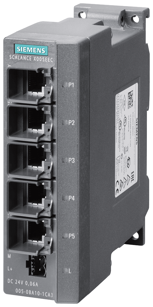SCALANCE X005EEC, IE Entry Level switch unmanaged 5x porte RJ45 da 10/100 Mbit/s, diagnostica LED, IP30, DC 24 V alimentazione di tensione, collare di ritenzione conforme a PROFINET, campo di temperatura ampliato -40 °C ..... +75 °C, omologazione E1 manuale disponibile come download . SCALANCE X005TS unmanaged switch compatto, 5x RJ45 da 10/100 Mbit/s, campo di temperatura esteso per il traffico stradale e ferroviario. Semplice interconnessione delle macchine in rete, impiego nel traffico stradale e ferroviario, campo di temperatura esteso. Funzionali, salvaspazio e adatti all'uso industriale: gli switch SCALANCE X005TS offrono sempre lo switch Compact Ethernet giusto per garantire una semplice interconnessione di macchine in rete. Grazie a varianti che possono avere da 5 a 8 porte è possibile realizzare senza problemi anche trasmissioni dati nell'ordine dei gigabit. I Compact Switch Module (CSM) permettono di realizzare un collegamento economico ai controllori SIMATIC e quindi l'integrazione delle macchine negli impianti esistenti. Con i nostri switch unmanaged e CSM robusti e facili da utilizzare, è possibile creare reti Industrial Ethernet a costi vantaggiosi.