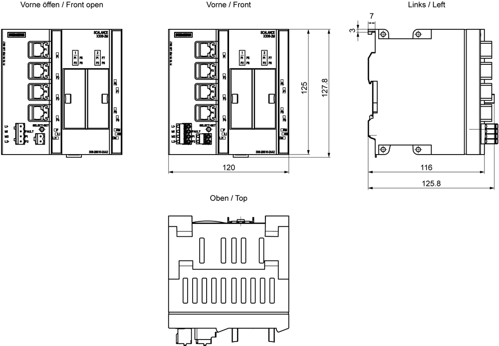 SCALANCE X308-2M; managed IE Switch, compatto; 4x 10/100/1000 Mbit/s per porte RJ45 elettriche; 2x 100/1000 Mbit/s per media module a 2 porte, elettriche oppure ottiche; diagnostica LED; contatto di segnalazione ; pulsante Select/Set; PROFINET IO Device; Network management; integrato manager di ridondanza; Office Features (RSTP, VLAN, IGMP,..); C-PLUG nella dotazione di fornitura. SCALANCE X308-2M managed, switch compatto di Layer 2, 4x RJ45 da 10/100/1000 Mbit/s, 2x 100/1000 Mbit/s per Media-Modules per la strutturazione flessibile di reti d'impianto performanti. Switch per quadro elettrico SCALANCE X308-2M flessibile e salvaspazio: la prossima generazione di reti industriali combina OT e IT per una produzione più flessibile e sicura. I nostri switch Ethernet SCALANCE X-300 come dispositivi compatti o come switch a 19" per il quadro elettrico assicurano un elevato livello di funzionalità e flessibilità con Industrial Edge e, in futuro, anche con Time-Sensitive Networking (TSN). Scoprite i molteplici vantaggi della nostra serie di apparecchi SCALANCE X-300: dagli switch per il quadro elettrico da utilizzare negli ambienti industriali agli switch Ethernet in design compatto, fino agli switch per le condizioni industriali più gravose: con SCALANCE X308-2M si trova sempre il giusto switch per numerose applicazioni.