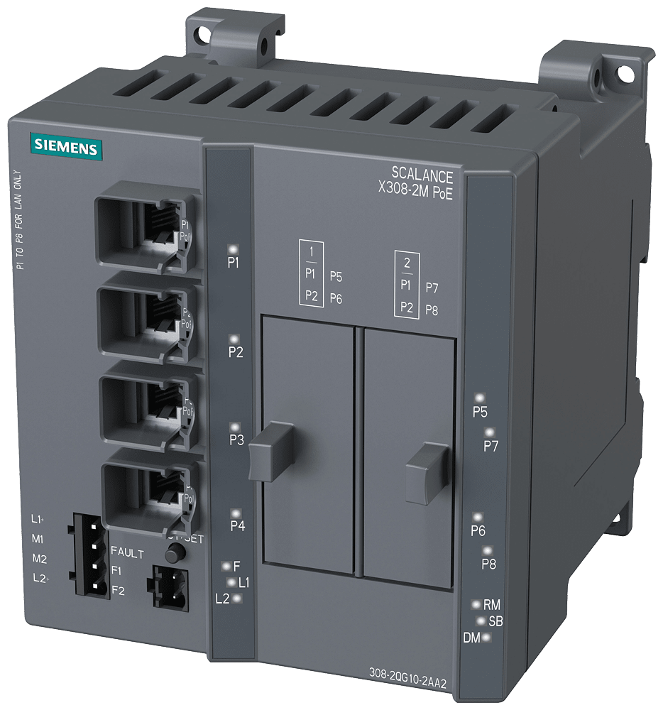 SCALANCE X308-2M PoE; managed IE Switch, compatto; 4x 10/100/1000 Mbit/s per porte RJ45 elettriche con PoE; 2x 100/1000 Mbit/s per media module a 2 porte, elettriche oppure ottiche; diagnostica LED, contatto di segnalazione contatto con pulsante Select/Set, PROFINET IO Device, Network management, integrato manager di ridondanza, Office Features (RSTP, VLAN, IGMP,..) C-PLUG nella dotazione di fornitura. SCALANCE X308-2M PoE managed, switch compatto di Layer 2, 4x RJ45 PoE da 10/100/1000 Mbit/s, 2x 100/1000 Mbit/s per Media-Modules per l'alimentazione di apparecchiature con funzionalità PoE. Switch per quadro elettrico SCALANCE X308-2M PoE flessibile e compatto: la prossima generazione di reti industriali combina OT e IT per una produzione più flessibile e sicura. I nostri switch Ethernet SCALANCE X-300 come dispositivi compatti o come switch a 19" per il quadro elettrico assicurano un elevato livello di funzionalità e flessibilità con Industrial Edge e, in futuro, anche con Time-Sensitive Networking (TSN). Scoprite i molteplici vantaggi della nostra serie di apparecchi SCALANCE X-300: dagli switch per il quadro elettrico da utilizzare negli ambienti industriali agli switch Ethernet in design compatto, fino agli switch per le condizioni industriali più gravose: con SCALANCE X308-2M si trova sempre il giusto switch per numerose applicazioni.