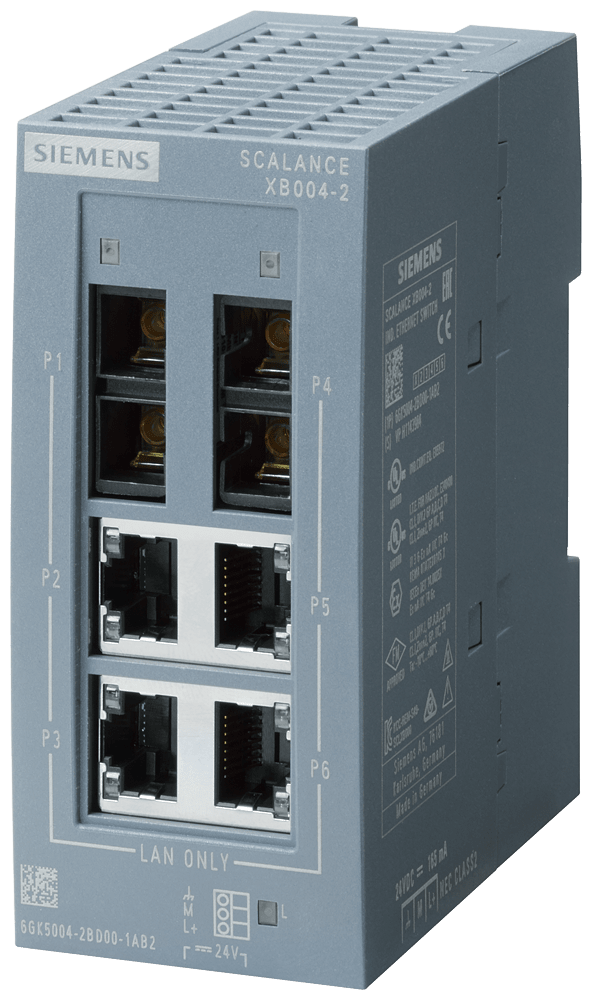 SCALANCE XB004-2 unmanaged Industrial Ethernet Switch per 10/100 Mbit/s; per la configurazione di piccole strutture a stella e strutture lineari; diagnostica LED, IP20, DC 24 V alimentazione di tensione, con 4x 10/100 Mbit/s Twisted Pair Ports con prese RJ45; 2x 100 Mbit/s Multimode porta a fibre ottiche con presa SC; manuale disponibile come download . SCALANCE XB004-2 unmanaged switch compatto, 4 x RJ45 da 10/100 Mbit/s, 2 x multimode SC da 100 Mbit/s per piccole reti IE. Impiego nel quadro elettrico/nella cassetta di comando per la realizzazione economica di piccole reti IE. Funzionali, compatti e adatti all'uso industriale: gli switch SCALANCE X-B004-2 offrono sempre lo switch Compact Ethernet giusto per garantire una semplice interconnessione di macchine in rete. Grazie a varianti che possono avere da 5 a 8 porte è possibile realizzare senza problemianche trasmissioni dati nell'ordine dei gigabit. I Compact Switch Module (CSM) permettono di realizzare un collegamento economico ai controllori SIMATIC e quindi l'integrazione delle macchine negli impianti esistenti. Con i nostri switch unmanaged e CSM robusti e facili da utilizzare, è possibile creare reti Industrial Ethernet a costi vantaggiosi.
