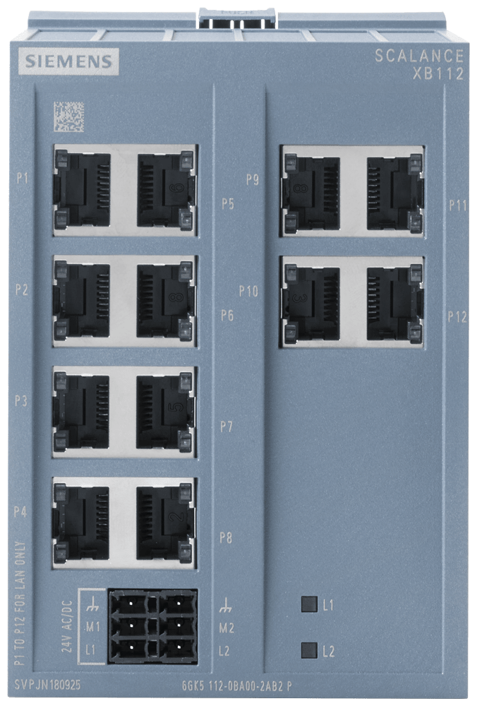 SCALANCE XB112 unmanaged IE Switch, 12x porte 10/100 Mbit/s RJ45, per la configurazione di piccole strutture a stella e strutture lineari; diagnostica LED, IP20, alimentazione di tensione ridondante, AC/DC 24V manuale disponibile come download . SCALANCE XB112, unmanaged switch, 12x porte RJ45 da 10/100 Mbit/s. Economico, semplice e versatile: uno SCALANCE XB112 è lo switch ideale per garantire una infrastruttura di rete affidabile e robusta. Con SCALANCE XB112 si trova sempre il giusto unmanaged switch per i collegamenti di reti elettriche e ottiche. Grazie all'hardware potente e alle funzioni avanzate, assicura l'integrazione diretta e la scalabilità per qualsiasi ambiente di rete. Con la nuova serie di unmanaged switch SCALANCE XCM-100 è possibile anche realizzare applicazioni Power over Ethernet. I nostri unmanaged switch e Media-Converter sono perfetti per l'impiego in vicinanza delle macchine nelle reti industriali e resistono anche alle condizioni ambientali gravose.