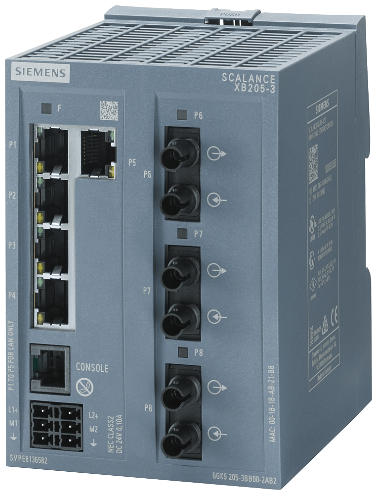 SCALANCE XB205-3 manageable Layer 2 IE Switch 5x porte RJ45 da 10/100 Mbit/s 3x porta MM FO ST 1x porta di console, LED di diagnostica, ridondante alimentazione di tensione; certificato IEC 62443-4-2; campo di temp. 0 °C ... +60 °C montaggio su guida profilata; EtherNet/IP predefinito. SCALANCE XB205-3 managed, box switch di Layer 2, 5x RJ45 da 10/100 Mbit/s, 3x multimode ST/BFOC per PROFINET ed EtherNet/IP, default: EtherNet/IP. Indicato per numerose applicazioni: Lo SCALANCE XB205-3 offre un'ampia varietà di switch Ethernet altamente performanti in diverse varianti: dagli switch Gigabit agli switch robusti per i requisiti dell'automazione discreta e di processo. I potenti switch Gigabit SCALANCE XB205-3 sono stati sviluppati per rispondere ai difficili requisiti delle reti negli ambienti industriali. Grazie all'hardware potente e alle funzioni avanzate, assicurano un'infrastruttura di rete affidabile e scalabile per qualsiasi applicazione. Realizzazione semplice e affidabile di molte applicazioni industriali.