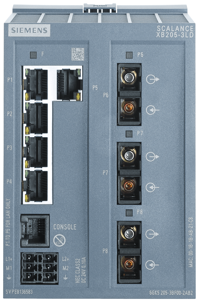 SCALANCE XB205-3LD manageable Layer 2 IE Switch 5x porte RJ45 da 10/100 Mbit/s 3x porte SC SM FO 1x porta di console, LED di diagnostica, ridondante alimentazione di tensione; certificato IEC 62443-4-2; campo di temp. 0°C ... +60°C; montaggio su guida profilata; PROFINET predefinito. SCALANCE XB205-3LD managed, box switch di Layer 2, 5x RJ45 da 10/100 Mbit/s, 3x singlemode SC per PROFINET ed EtherNet/IP, default: PROFINET. Indicato per numerose applicazioni: Lo SCALANCE XB205-3LD offre un'ampia varietà di switch Ethernet altamente performanti in diverse varianti: dagli switch Gigabit agli switch robusti per i requisiti dell'automazione discreta e di processo. I potenti switch Gigabit SCALANCE XB205-3LD sono stati sviluppati per rispondere ai difficili requisiti delle reti negli ambienti industriali. Grazie all'hardware potente e alle funzioni avanzate, assicurano un'infrastruttura di rete affidabile e scalabile per qualsiasi applicazione. Realizzazione semplice e affidabile di molte applicazioni industriali.