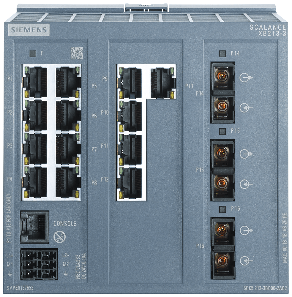 SCALANCE XB213-3 manageable Layer 2 IE Switch 13x porte RJ45 da 10/100 Mbit/s, 3x porta MM FO SC 1x porta di console, LED di diagnostica, ridondanza della alimentazione di tensione, certificato IEC 62443-4-2; campo di temp. 0°C ... +60°C; montaggio su guida profilata; PROFINET predefinito. SCALANCE XB213-3 managed, box switch di Layer 2, 13x RJ45 da 10/100 Mbit/s, 3x multimode SC per PROFINET ed EtherNet/IP, default: applicazioni PROFINET ed EtherNet/IP. Impostazioni PROFINET standard. Indicato per numerose applicazioni: Lo SCALANCE XB213-3 offre un'ampia varietà di switch Ethernet altamente performanti in diverse varianti: dagli switch Gigabit agli switch robusti per i requisiti dell'automazione discreta e di processo. I potenti switch Gigabit SCALANCE XB213-3 sono stati sviluppati per rispondere ai difficili requisiti delle reti negli ambienti industriali. Grazie all'hardware potente e alle funzioni avanzate, assicurano un'infrastruttura di rete affidabile e scalabile per qualsiasi applicazione. Realizzazione semplice e affidabile di molte applicazioni industriali.
