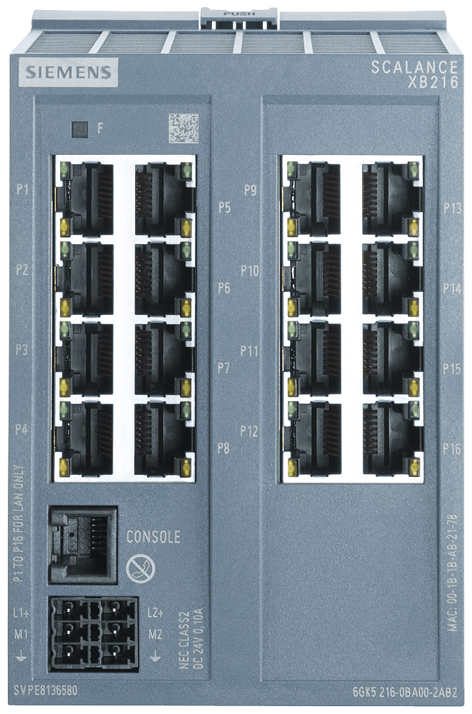 SCALANCE XB216 manageable Switch IE di Layer 2, 16X porte RJ45 da 10/100 Mbit/s, 1x porta di console, LED di diagnostica alimentazione di tensione ridondante certificato IEC 62443-4-2; campo di temp. 0°C ... +60°C; montaggio su guida profilata, PROFINET IO Device certificato Ethernet/IP, PROFINET predefinito. SCALANCE XB216 managed, box switch di Layer 2, 16x RJ45 da 10/100 Mbit/s per PROFINET ed EtherNet/IP, default: applicazioni PROFINET ed EtherNet/IP. Impostazioni PROFINET standard. Indicato per numerose applicazioni: Lo SCALANCE XB216 offre un'ampia varietà di switch Ethernet altamente performanti in diverse varianti: dagli switch Gigabit agli switch robusti per i requisiti dell'automazione discreta e di processo. I potenti switch Gigabit SCALANCE XB216 sono stati sviluppati per rispondere ai difficili requisiti delle reti negli ambienti industriali. Grazie all'hardware potente e alle funzioni avanzate, assicurano un'infrastruttura di rete affidabile e scalabile per qualsiasi applicazione. Realizzazione semplice e affidabile di molte applicazioni industriali.