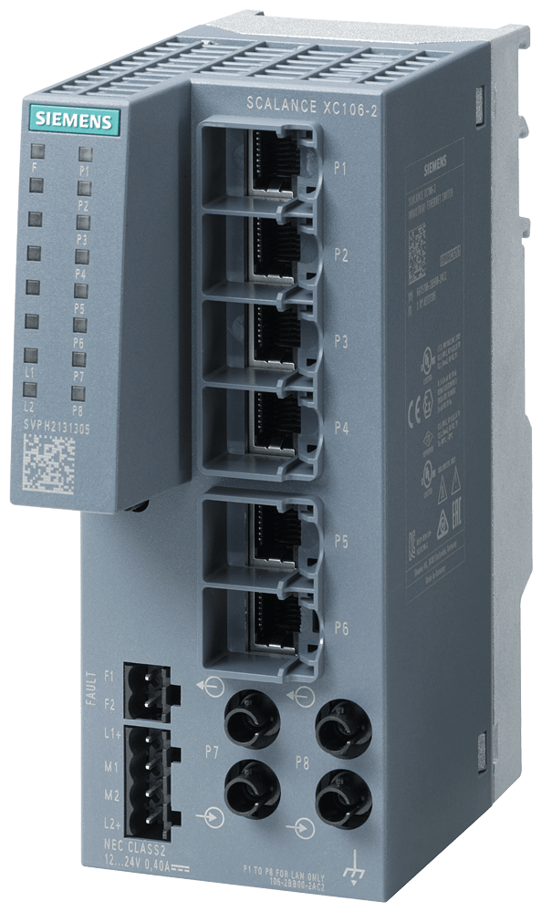 SCALANCE XC106-2, IE unmanaged switch, 6x 10/100 Mbit/s RJ45, 2x 100 Mbit/s Multimode BFOC, diagnostica LED, contatto di segnalazione errore con tasto SET, ridondanza della alimentazione di tensione manuale disponibile come download . SCALANCE XC106-2 unmanaged switch compatto, 6x RJ45 da 10/100 Mbit/s, 2x multimode ST/BFOC da 100 Mbit/s per la semplice interconnessione di macchine in rete. Economico, semplice e versatile: uno SCALANCE XC106-2 è lo switch ideale per garantire una infrastruttura di rete affidabile e robusta. Con SCALANCE XC106-2 si trova sempre il giusto unmanaged switch per i collegamenti di reti elettriche e ottiche. Grazie all'hardware potente e alle funzioni avanzate, assicura l'integrazione diretta e la scalabilità per qualsiasi ambiente di rete. Con la nuova serie di unmanaged switch SCALANCE XCM-100 è possibile anche realizzare applicazioni Power over Ethernet. I nostri unmanaged switch e Media-Converter sono perfetti per l'impiego in vicinanza delle macchine nelle reti industriali e resistono anche alle condizioni ambientali gravose.