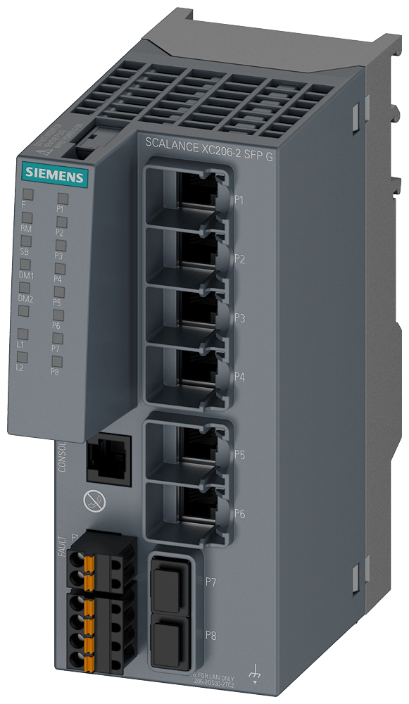SCALANCE XC206-2SFP G (E/IP) manageable IE Switch di Layer 2; certificato IEC 62443-4-2; 6x 10/100/1000 Mbit/s porte RJ45; 2x SFP da 1000 Mbit/s; 1x porta console; LED di diagnostica; alimentazione di tensione ridondante; campo di temp.-40°C...+70°C; montaggio: su guida DIN/profilata S7/a parete; funzioni di ridondanza; Office Features (RSTP, VLAN,...); PROFINET IO Device; conforme a Ethernet/IP; slot C-PLUG; EtherNet/IP predefinito. IEEE 1588v2 PTP SCALANCE XC206-2SFP G (E/IP), managed switch di Layer 2, 6x RJ45, 2x SFP, def.: E/IP. Indicato per numerose applicazioni: Lo SCALANCE XC206-2SFP offre un'ampia varietà di switch Ethernet altamente performanti in diverse varianti: dagli switch Gigabit agli switch robusti per i requisiti dell'automazione discreta e di processo. I potenti switch Gigabit SCALANCE XC206-2SFP sono stati sviluppati per rispondere ai difficili requisiti delle reti negli ambienti industriali. Grazie all'hardware potente e alle funzioni avanzate, assicurano un'infrastruttura di rete affidabile e scalabile per qualsiasi applicazione. Realizzazione semplice e affidabile di molte applicazioni industriali.