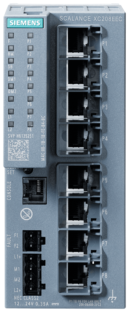 SCALANCE XC208EEC manageable IE Switch di Layer 2; certificato IEC 62443-4-2; 8x porte RJ45 da 10/100 Mbit/s; 1x porta di console; LED di diagnostica; alimentazione di tensione ridondante; con schede di circuito stampato verniciate; conforme a NAMUR NE21; campo di temp.-40 °C...+70 °C; montaggio: su guida DIN/profilata S7/a parete; funzioni di ridondanza; Office; Features (RSTP, VLAN,...); PROFINET IO Device; conforme a Ethernet/IP; slot C-PLUG; SCALANCE XC208EEC, managed switch di Layer 2, 8x RJ45. Indicato per numerose applicazioni: Lo SCALANCE XC208EEC offre un'ampia varietà di switch Ethernet altamente performanti in diverse varianti: dagli switch Gigabit agli switch robusti per i requisiti dell'automazione discreta e di processo. I potenti switch Gigabit SCALANCE XC208EEC sono stati sviluppati per rispondere ai difficili requisiti delle reti negli ambienti industriali. Grazie all'hardware potente e alle funzioni avanzate, assicurano un'infrastruttura di rete affidabile e scalabile per qualsiasi applicazione. Realizzazione semplice e affidabile di molte applicazioni industriali.