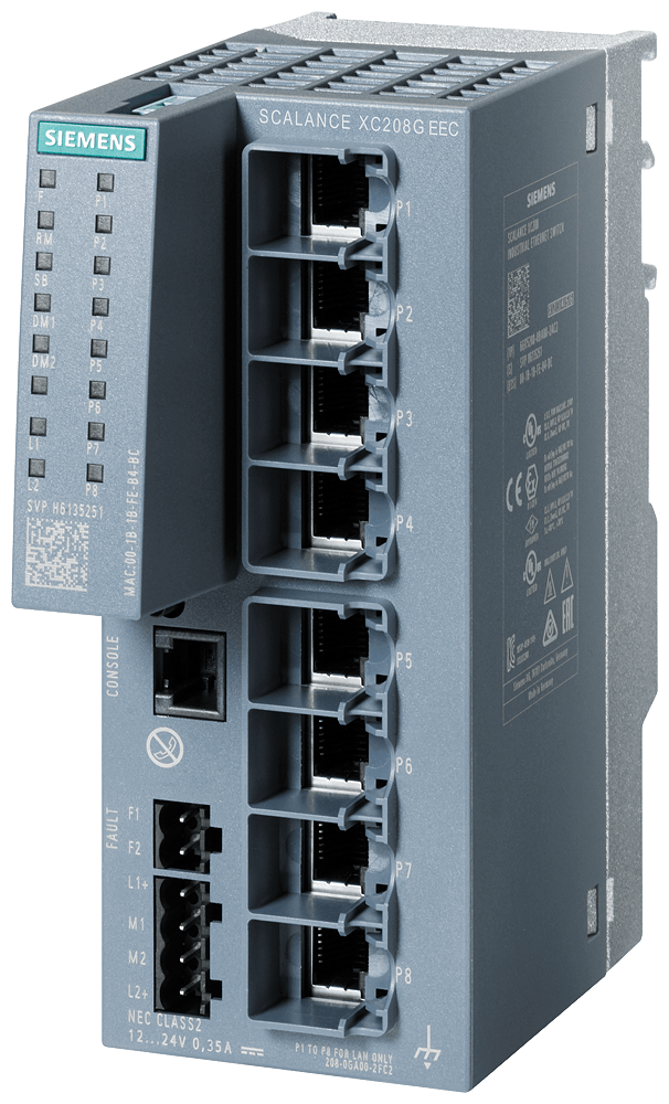 SCALANCE XC208G EEC manageable IE Switch di Layer 2; certificato IEC 62443-4-2; 8x 10/100/1000 Mbit/s porte RJ45; 1x porta di console; LED di diagnostica; alimentazione di tensione ridondante; con schede di circuito stampato verniciate; conforme a NAMUR NE21; campo di temp.-40 °C...+70 °C; montaggio: su guida DIN/profilata S7/a parete; funzioni di ridondanza; Office Features (RSTP, VLAN,...); PROFINET IO Device; conforme a Ethernet/IP; slot C-PLUG; SCALANCE XC208G EEC, managed switch di Layer 2, 8x RJ45 per Industrial Ethernet (PROFINET ed EtherNet/IP). Impiegabile nei settori più svariati: costruzione di macchine, industria automobilistica, industria dei generi alimentari e voluttuari, lungo linee di trasporto su rotaia o nell'industria del petrolio e del gas. Indicato per numerose applicazioni: Lo SCALANCE XC208G offre un'ampia varietà di switch Ethernet altamente performanti in diverse varianti: dagli switch Gigabit agli switch robusti per i requisiti dell'automazione discreta e di processo. I potenti switch Gigabit SCALANCE XC208G sono stati sviluppati per rispondere ai difficili requisiti delle reti negli ambienti industriali. Grazie all'hardware potente e alle funzioni avanzate, assicurano un'infrastruttura di rete affidabile e scalabile per qualsiasi applicazione. Realizzazione semplice e affidabile di molte applicazioni industriali.