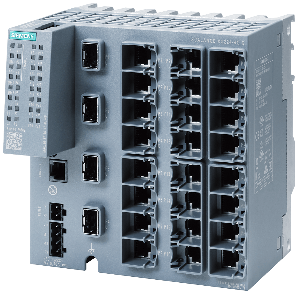 SCALANCE XC224-4C G (E/IP) manageable IE Switch di Layer 2; certificato IEC 62443-4-2; Full-Gigabit; 20x 10/100/1000 Mbit/s porte RJ45; 4x 1000 Mbit/s porte Combo (1000 Mbit/s SFP o porte RJ45 da 10/100/1000 Mbit/s utilizzabili); 1x porta console; LED di diagnostica; alimentazione di tensione ridondante; campo di temp.-40°C...+70°C; montaggio: su guida DIN/profilata S7/a parete; funzioni di ridondanza; Office Features (RSTP, VLAN,...); PROFINET IO Device; conforme a Ethernet/IP; slot C-PLUG; EtherNet/IP predefinito; IEEE 1588v2 PTP SCALANCE XC224-4C G (E/IP), managed switch L2, 20x RJ45, 4x porte combo (SFP/RJ45). Indicato per numerose applicazioni: Lo SCALANCE X224-4C offre un'ampia varietà di switch Ethernet altamente performanti in diverse varianti: dagli switch Gigabit agli switch robusti per i requisiti dell'automazione discreta e di processo. I potenti switch Gigabit SCALANCE X224-4C sono stati sviluppati per rispondere ai difficili requisiti delle reti negli ambienti industriali. Grazie all'hardware potente e alle funzioni avanzate, assicurano un'infrastruttura di rete affidabile e scalabile per qualsiasi applicazione. Realizzazione semplice e affidabile di molte applicazioni industriali.
