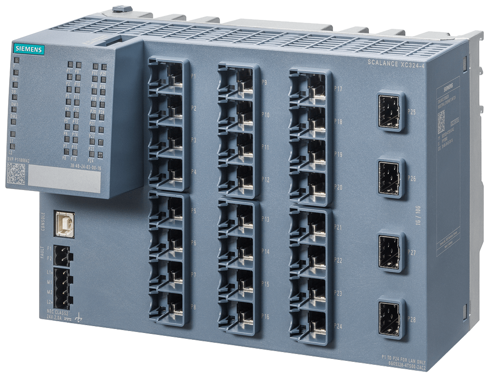 SCALANCE XC324-4 managed Switch IE di Layer 2, 24x RJ45 da 10/100/1000 Mbit/s, 4x porte 1/10 Gbit/s SFP+, LED per diagnostica,contatto di segnalazione errore con pulsante Select/Set, PROFINET IO Device, Network Management, funzioni di ridondanza, Office Features (RSTP, VLAN, IGMP,..) CLP nella dotazione di fornitura montaggio: guida DIN/profilata S7 . SCALANCE XC324-4 managed, switch compatto di Layer 2, 24x porte RJ45 da 10/100/1000 Mbit/s, 4x porte SFP+ da 1/10 Gbit/s per reti d'impianto flessibili e altamente performanti. Switch per quadro elettrico SCALANCE XC324-4 flessibile e compatto: la prossima generazione di reti industriali combina OT e IT per una produzione più flessibile e sicura. I nostri switch Ethernet SCALANCE XC-300 come apparecchi compatti o come switch a 19" per il quadro elettrico assicurano un elevato livello di funzionalità e flessibilità con Industrial Edge e, in futuro, anche con Time-Sensitive Networking (TSN). Scoprite i molteplici vantaggi della nostra serie di apparecchi SCALANCE XC-300: dagli switch per il quadro elettrico da utilizzare negli ambienti industriali agli switch Ethernet in design compatto, fino agli switch per le condizioni industriali più gravose: con SCALANCE XC324-4 si trova sempre il giusto switch per numerose applicazioni.