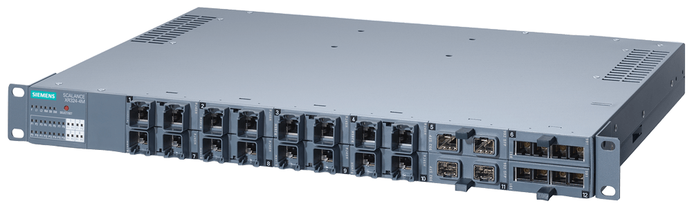 SCALANCE XR324-4M EEC; switch IE managed, rack da 19"; 16x 10/100/1000 Mbit/s per porte RJ45 elettriche; 4x 100/1000 Mbit/s per media module a 2 porte, elettriche oppure ottiche; diagnostica LED; contatto di segnalazione ; pulsante Select/Set, PROFINET IO Device, Network management, integrato manager di ridondanza; alimentazione di tensione 1 x AC 230 V; porte frontali SCALANCE XR324-4M EEC managed, rack switch di Layer 2, 16x RJ45 da 10/100/1000 Mbit/s, 4x 100/1000 Mbit/s per Media-Modules, 1x AC 230 V, porte sul lato anteriore, per condizioni ambientali estese. Installazione in rack da 19 pollici per la configurazione di reti strutturate. Switch per quadro elettrico SCALANCE XR324-4M flessibile e compatto: la prossima generazione di reti industriali combina OT e IT per una produzione più flessibile e sicura. I nostri switch Ethernet SCALANCE X-300 come dispositivi compatti o come switch a 19" per il quadro elettrico assicurano un elevato livello di funzionalità e flessibilità con Industrial Edge e, in futuro, anche con Time-Sensitive Networking (TSN). Scoprite i molteplici vantaggi della nostra serie di apparecchiature SCALANCE XR-300: dagli switch per il quadro elettrico da utilizzare negli ambienti industriali agli switch Ethernet in design compatto, fino agli switch per le condizioni industriali più gravose: con SCALANCE XR324-4M si trova sempre il giusto switch per numerose applicazioni.