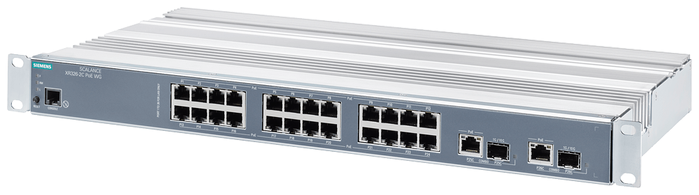 SCALANCE XR326-2C PoE WG; switch IE managed, rack da 19"; 24 x porte elettriche PoE 1GE 2 x porte elettriche 10GE Combo PoE, elettriche o ottiche; diagnostica LED; tasto Reset; porta di console; PROFINET Device; Network Management function; Redundancy Manager; alimentazione di tensione AC 240 V (85 – 264V). SCALANCE XR326-2C PoE WG managed, rack switch workgroup di Layer 2, 24x porte RJ45 PoE da 1000 Mbit/s, 2x porte combo PoE da 1000/10000 Mbit/s, ADC 240 V, a costo ottimizzato per grandi sale controllo. Switch per quadro elettrico SCALANCE XR326-2C flessibile e compatto: la prossima generazione di reti industriali combina OT e IT per una produzione più flessibile e sicura. I nostri switch Ethernet SCALANCE XR-300 come apparecchi compatti o come switch a 19" per il quadro elettrico assicurano un elevato livello di funzionalità e flessibilità con Industrial Edge e, in futuro, anche con Time-Sensitive Networking (TSN). Scoprite i molteplici vantaggi della nostra serie di apparecchiature SCALANCE XR-300: dagli switch per il quadro elettrico da utilizzare negli ambienti industriali agli switch Ethernet in design compatto, fino agli switch per le condizioni industriali più gravose: con SCALANCE XR326-2C si trova sempre il giusto switch per numerose applicazioni.