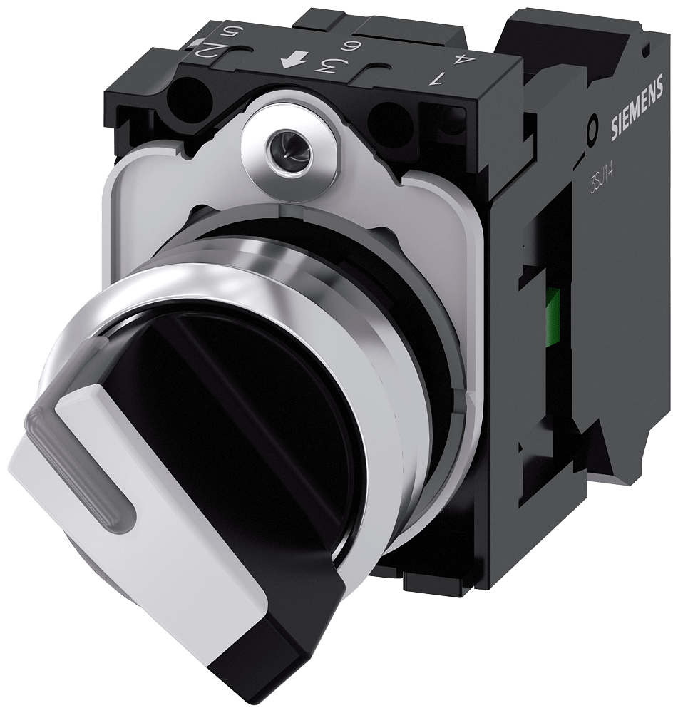 selettore, illuminabile, 22 mm, rotondo, in metallo, lucido, bianco, selettore, breve, 2 posizioni di commutazione O-I, permanente, angolo di intervento 90°, 10:30 h/13:30 h, con supporto, 1 NO, morsetto a molla Selettore SIRIUS ACT per la commutazione e il comando di utilizzatori elettrici. Siemens offre, sotto il nome commerciale SIRIUS ACT, un portfolio esclusivo di dispositivi di comando e segnalazione con omologazioni di prodotto per il mercato mondiale in tre moderne serie di design in robusto metallo puro e plastica pregiata.L'innovativo concetto di innesto a scatto semplifica talmente il montaggio che per eseguirlo basta una sola mano e non servono attrezzi speciali. Per i fori di montaggio sono sufficienti semplici fori non scanalati, essendo già integrata una protezione antirotazione al 100 %.Grazie al grado di protezione elevato i robusti apparecchi sono adatti all'impiego industriale e in ambiente esterno. È persino possibile la pulizia con getto ad alta pressione. Né polvere, né oli, né liscivia possono comprometterne il funzionamento affidabile.Oltre che con il cablaggio standard, gli apparecchi possono essere collegati al controllore anche tramite PROFINET, AS-Interface oppure IO-Link. Potete così ridurre il vostro onere di cablaggio, minimizzare le fonti di errore e ottenere maggiore flessibilità.Il configuratore online grafico supporta in modo confortevole la scelta e l'ordinazione di singoli apparecchi, pulsantiere e iscrizioni. È disponibile una documentazione completa (ad es. manuale, dati 3D, schema di collegamento). Esecuzioni fornibili: più colori, 2-4 posizioni di commutazione, operatore corto/lungo o manopola, luminoso/non luminoso (illuminazione anche applicabile a posteriori), comando permanente/ad impulso. Avvertenza: Apparecchio completo, fornitura incl. supporto e moduli. SIRIUS ACT - Performance in Action nel comando e nella segnalazione. Semplici da montare, altamente performanti, semplicemente perfetti.