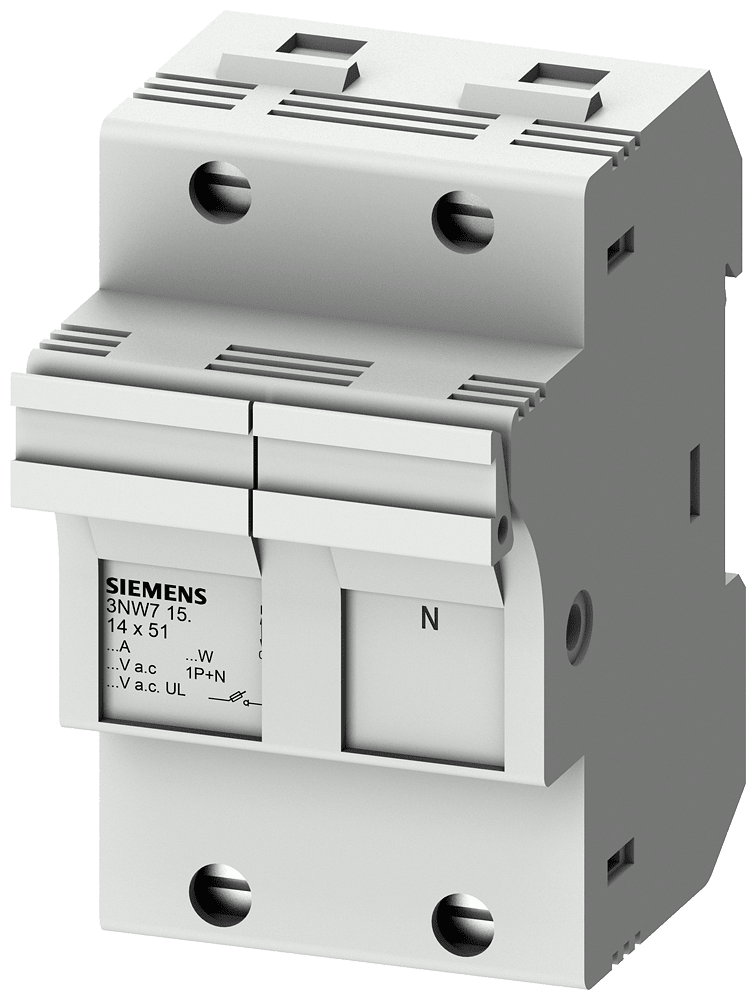 SENTRON, portafusibili per cartucce cilindriche, 14x51 mm, 1P+N, In: 50 A, Un AC: 690 V, controllore d'intervento universale a LED SENTRON, sistema di fusibili cilindrici per la protezione selettiva degli impianti. Le cartucce fusibili cilindriche e i relativi portafusibili sono adatti all'impiego in impianti industriali. Essi sono uno standard europeo e sono testati e omologati come sezionatori a fusibili ma non per la manovra sotto carico. Per la manovra sotto carico Siemens offre un'ampia gamma di prodotti ad es. i sezionatori 3KF. I sistemi di fusibili cilindrici si contraddistinguono soprattutto per le seguenti caratteristiche: 1. Conformità alle norme IEC 60269-1, -2 e -3. 2. Conformità alla norma UL 512. 3. Rapida sostituzione del fusibile grazie al posto per fusibili di ricambio nel portafusibili. 4. Rapido riconoscimento del fusibile bruciato mediante LED lampeggiante in caso di intervento.