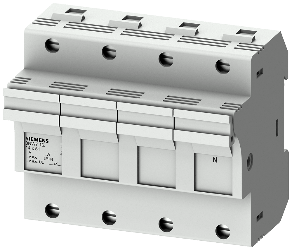 SENTRON, portafusibili per cartucce cilindriche, 14x51 mm, 3P+N, In: 50 A, Un AC: 690 V, controllore d'intervento universale a LED SENTRON, sistema di fusibili cilindrici per la protezione selettiva degli impianti. Le cartucce fusibili cilindriche e i relativi portafusibili sono adatti all'impiego in impianti industriali. Essi sono uno standard europeo e sono testati e omologati come sezionatori a fusibili ma non per la manovra sotto carico. Per la manovra sotto carico Siemens offre un'ampia gamma di prodotti ad es. i sezionatori 3KF. I sistemi di fusibili cilindrici si contraddistinguono soprattutto per le seguenti caratteristiche: 1. Conformità alle norme IEC 60269-1, -2 e -3. 2. Conformità alla norma UL 512. 3. Rapida sostituzione del fusibile grazie al posto per fusibili di ricambio nel portafusibili. 4. Rapido riconoscimento del fusibile bruciato mediante LED lampeggiante in caso di intervento.