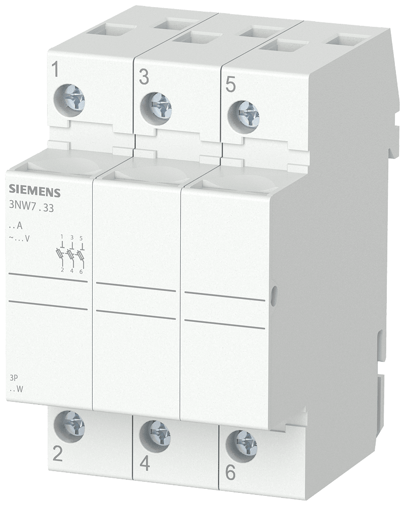 SENTRON, portafusibili per cartucce cilindriche, 10x38 mm, a 3 poli, In: 32 A, Un AC: 690 V SENTRON, sistema di fusibili cilindrici per la protezione selettiva degli impianti. Le cartucce fusibili cilindriche e i relativi portafusibili sono adatti all'impiego in impianti industriali. Essi sono uno standard europeo e sono testati e omologati come sezionatori a fusibili ma non per la manovra sotto carico. Per la manovra sotto carico Siemens offre un'ampia gamma di prodotti ad es. i sezionatori 3KF. I sistemi di fusibili cilindrici si contraddistinguono soprattutto per le seguenti caratteristiche: 1. Conformità alle norme IEC 60269-1, -2 e -3. 2. Conformità alla norma UL 512. 3. Rapida sostituzione del fusibile grazie al posto per fusibili di ricambio nel portafusibili. 4. Rapido riconoscimento del fusibile bruciato mediante LED lampeggiante in caso di intervento.